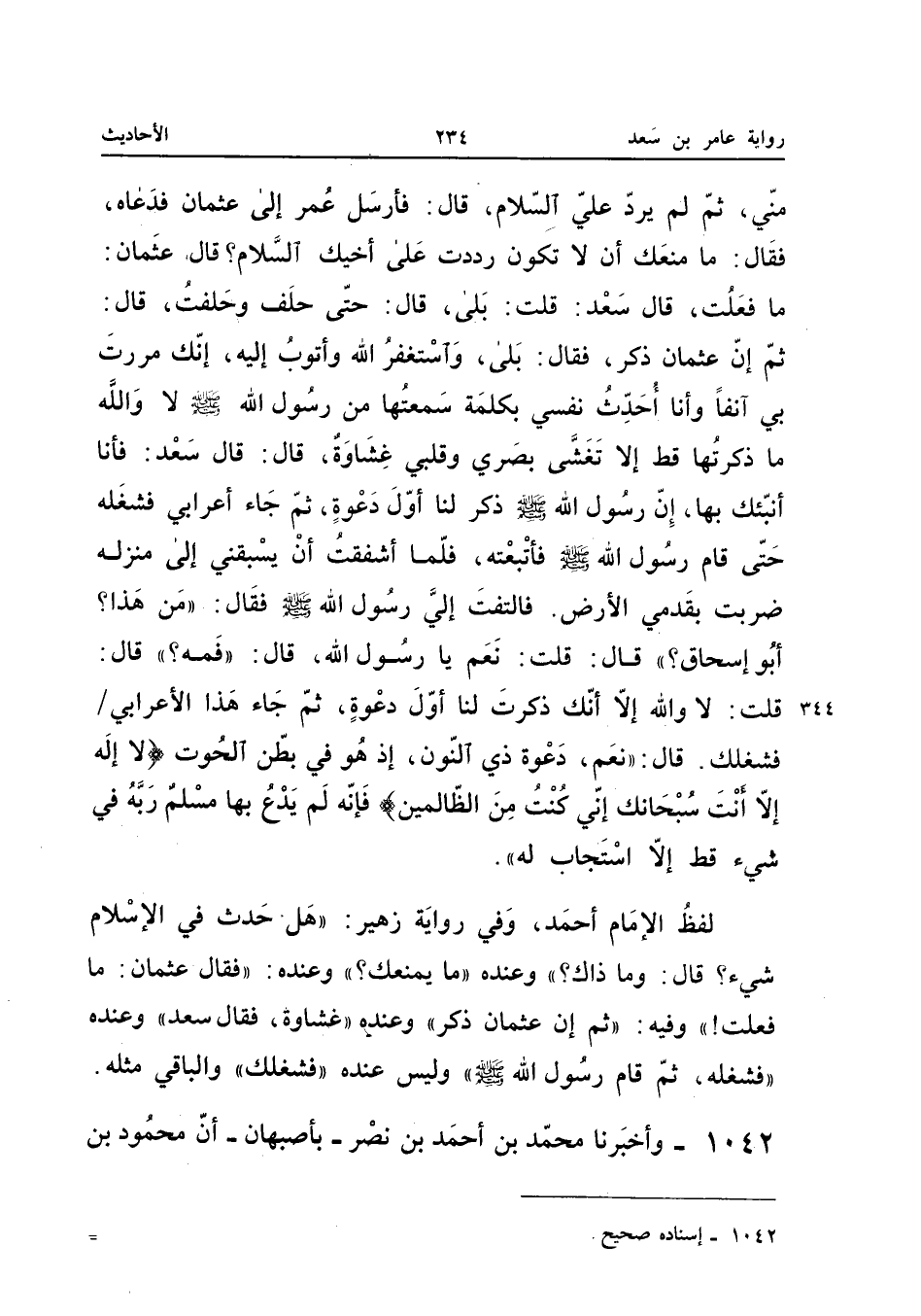 مِنِّي ثُمَّ لَمْ يَرُدَّ عَلَيَّ السَّلامَ قَالَ فَأَرْسَلَ عُمَرُ إِلَى عُثْمَانَ فَدَعَاهُ فَقَالَ مَا مَنَعَكَ أَنْ لَا تَكُونَ رَدَدْتَ عَلَى أَخِيكَ السَّلامَ قَالَ عُثْمَانُ مَا فَعَلْتُ قَالَ سَعْدٌ قُلْتُ بَلَى قَالَ حَتَّى حَلَفَ وَحَلَفْتُ قَالَ ثُمَّ إِنَّ عُثْمَانَ ذَكَرَ فَقَالَ بَلَى وَأَسْتَغْفِرُ اللَّهَ وَأَتُوبُ إِلَيْهِ إِنَّكَ مَرَرْتَ بِي آنِفًا وَأَنَا أُحَدِّثُ نَفْسِي بِكَلِمَةٍ سَمِعْتُهَا مِنْ رَسُولِ اللَّهِ صَلَّى اللَّهُ عَلَيْهِ وَسَلَّمَ لَا وَاللَّهِ مَا ذَكَرْتُهَا قَطُّ إِلا تَغَشَّى بَصَرِي وَقَلْبِي غِشَاوَةٌ قَالَ قَالَ سَعْدٌ فَأَنَا أُنَبِّئُكَ بِهَا إِنَّ رَسُولَ اللَّهِ صَلَّى اللَّهُ عَلَيْهِ وَسَلَّمَ ذَكَرَ لَنَا أَوَّلَ دَعْوَةٍ ثُمَّ جَاءَ أَعْرَابِيٌّ فَشَغَلَهُ حَتَّى قَامَ رَسُولُ اللَّهِ صَلَّى اللَّهُ عَلَيْهِ وَسَلَّمَ فَاتَّبَعْتُهُ فَلَمَّا أَشْفَقْتُ أَنْ يَسْبِقَنِي إِلَى مَنْزِلِهِ ضَرَبْتُ بِقَدَمِي الأَرْضَ فَالْتَفَتَ إِلَيَّ رَسُولِ اللَّهِ صَلَّى اللَّهُ عَلَيْهِ وَسَلَّمَ فَقَالَ مَنْ هَذَا أَبُو إِسْحَاقَ قَالَ قُلْتُ نَعَمْ يَا رَسُولَ اللَّهِ قَالَ فَمَهٍ قَالَ قُلْتُ لَا وَاللَّهِ إِلا أَنَّكَ ذَكَرْتَ لَنَا أَوَّلَ دَعْوَةٍ ثُمَّ جَاءَ هَذَا الأَعْرَابِيُّ فَشَغَلَكَ قَالَ نَعَمْ دَعْوَةُ ذِي النُّونِ إِذْ هُوَ فِي بَطْنِ الْحُوتِ {لَا إِلَهَ إِلا أَنْتَ سُبْحَانَكَ إِنِّي كنت من الظَّالِمين} فَإِنَّهُ لَمْ يَدْعُ بِهَا مُسْلِمٌ رَبَّهُ فِي شَيْءٍ قَطُّ إِلا اسْتَجَابَ لَهُ لَفْظُ الإِمَامِ أَحْمَدَ وَفِي رِوَايَةِ زُهَيْرٍ هَلْ حَدَثَ فِي الْإِسْلَام شيئ قَالَ وَمَا ذَاكَ وَعِنْدَهُ مَا يَمْنَعُكَ وَعِنْدَهُ فَقَالَ عُثْمَانُ مَا فَعَلْتُ وَفِيهِ ثُمَّ إِنَّ عُثْمَانَ ذَكَرَ وَعِنْدَهُ غِشَاوَةٌ فَقَالَ سَعْدٌ وَعِنْدَهُ فَشَغَلَهُ ثُمَّ قَامَ رَسُولُ اللَّهِ صَلَّى اللَّهُ عَلَيْهِ وَسَلَّمَ وَلَيْسَ عِنْدَهُ فَشَغَلَكَ وَالْبَاقِي مِثْلُهُ (إِسْنَاده صَحِيح)