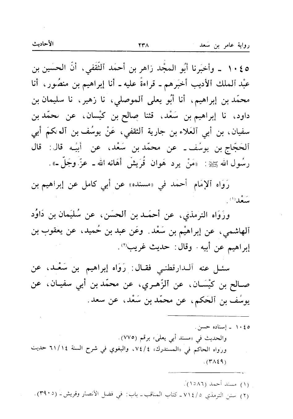 1045 - وَأَخْبَرَنَا أَبُو الْمَجْدِ زَاهِرُ بْنُ أَحْمَدَ الثَّقَفِيُّ أَن الْحُسَيْن بن عبد الْملك الأَدِيبَ أَخْبَرَهُمْ قِرَاءَةً عَلَيْهِ أَنا إِبْرَاهِيمُ بْنُ مَنْصُورٍ أَنا مُحَمَّدُ بْنُ إِبْرَاهِيمَ أَنا أَبُو يَعْلَى الْمَوْصِلِيُّ نَا زُهَيْرٌ نَا سُلَيْمَانُ بْنُ دَاوُدَ نَا إِبْرَاهِيمُ بْنُ سَعْدٍ قثنا صَالِحُ بْنُ كَيْسَانَ عَنْ مُحَمَّدِ بْنِ سُفْيَانَ بْنِ أَبِي الْعَلاءِ بْنِ جَارِيَةَ الثَّقَفِيِّ عَنْ يُوسُفَ بْنِ الْحَكَمِ أَبِي الْحَجَّاجِ بْنِ يُوسُفَ عَنْ مُحَمَّدِ بْنِ سَعْدٍ عَنْ أَبِيهِ قَالَ قَالَ رَسُولُ اللَّهِ صَلَّى اللَّهُ عَلَيْهِ وَسَلَّمَ مَنْ يُرِدْ هَوَانَ قُرَيْشٍ أَهَانَهُ اللَّهُ عَزَّ وَجَلَّ رَوَاهُ الإِمَامُ أَحْمَدُ فِي مُسْنَدِهِ عَنْ أَبِي كَامِلٍ عَنْ إِبْرَاهِيمَ بْنِ سَعْدٍ وَرَوَاهُ التِّرْمِذِيُّ عَنْ أَحْمَدَ بْنِ الْحَسَنِ عَنْ سُلْيَمَانَ بْنِ دَاوُدَ الْهَاشِمِيِّ عَنْ إِبْرَاهِيمَ بْنِ سَعْدٍ وَعَنْ عَبْدِ بْنِ حُمَيْدٍ عَنْ يَعْقُوبَ بْنِ إِبْرَاهِيمَ عَنْ أَبِيهِ وَقَالَ حَدِيثٌ غَرِيبٌ سُئِلَ عَنْهُ الدَّارَقُطْنِيُّ فَقَالَ رَوَاهُ إِبْرَاهِيمُ بْنُ سَعْدٍ عَنْ صَالِحِ بْنِ كَيْسَانَ عَنِ الزُّهْرِيِّ عَنْ مُحَمَّدِ بْنِ أَبِي سُفْيَانَ عَنْ يُوسُفَ بْنِ الْحَكَمِ عَنْ مُحَمَّدِ بْنِ سَعْدٍ عَنْ سَعْدٍ