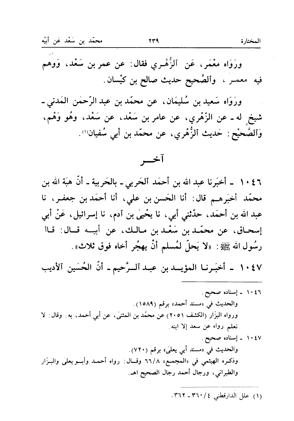 1046 - أخبرنَا عبد الله بْنُ أَحْمَدَ الْحَرْبِيُّ بِالْحَرْبِيَّةِ أَنَّ هِبَةَ اللَّهِ بْنَ مُحَمَّدٍ أَخْبَرَهُمْ قَالَ أَنا الْحَسَنُ بْنُ عَليّ أَنا أَحْمد بن جَعْفَر نَا عبد الله بْنُ أَحْمَدَ حَدَّثَنِي أَبِي نَا يَحْيَى بْنُ آدَمَ نَا إِسْرَائِيلُ عَنْ أَبِي إِسْحَاقَ عَنْ مُحَمَّدِ بْنِ سَعْدِ بْنِ مَالِكٍ عَنْ أَبِيهِ قَالَ قَالَ رَسُولُ اللَّهِ صَلَّى اللَّهُ عَلَيْهِ وَسَلَّمَ لَا يَحِلُّ لِمُسْلِمٍ أَنْ يَهْجُرَ أَخَاهُ فَوق ثَلَاث (إِسْنَاده صَحِيح)