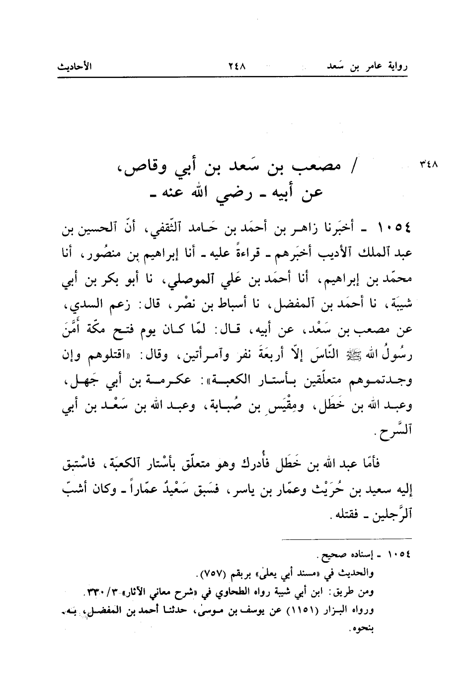 1054 - أَخْبَرَنَا زَاهِرُ بْنُ أَحْمَدَ بْنِ حَامِدٍ الثَّقَفِيُّ أَنَّ الْحُسَيْنَ بْنَ عبد الْملك الأَدِيبَ أَخْبَرَهُمْ قِرَاءَةً عَلَيْهِ أَنا إِبْرَاهِيمُ بْنُ مَنْصُورٍ أَنا مُحَمَّدُ بْنُ إِبْرَاهِيمَ أَنا أَحْمَدُ بْنُ عَلِيٍّ الْمَوْصِلِيُّ نَا أَبُو بَكْرِ بْنُ أَبِي شَيْبَةَ نَا أَحْمَدُ بْنُ الْمُفَضَّلِ نَا أَسْبَاطُ بْنُ نَصْرٍ قَالَ زَعَمَ السُّدِّيُّ عَنْ مُصْعَبِ بْنِ سَعْدٍ عَنْ أَبِيهِ قَالَ لَمَّا كَانَ يَوْمُ فَتْحِ مَكَّةَ أَمَّنَ رَسُولُ اللَّهِ صَلَّى اللَّهُ عَلَيْهِ وَسَلَّمَ النَّاسَ إِلا أَرْبَعَةَ نَفَرٍ وَامْرَأَتَيْنِ وَقَالَ اقْتُلُوهُمْ وَإِنْ وَجَدْتُمُوهُمْ مُتَعَلِّقِينَ بِأَسْتَارِ الْكَعْبَة عِكْرِمَة بن أبي جهل وَعبد الله بن خطل وَمقيس بن صبَابَة وَعبد الله بن سعد بن أبي السَّرْح فَأَما عبد الله بْنُ خَطَلٍ فَأُدْرِكَ وَهُوَ مُتَعَلِّقٌ بِأَسْتَارِ الْكَعْبَةِ فَاسْتَبَقَ إِلَيْهِ سَعِيدُ بْنُ حُرَيْثٍ وَعَمَّارُ بْنُ يَاسِرٍ فَسَبَقَ سَعِيدٌ عَمَّارًا وَكَانَ أَشَبَّ الرَّجُلَيْنِ فَقتله