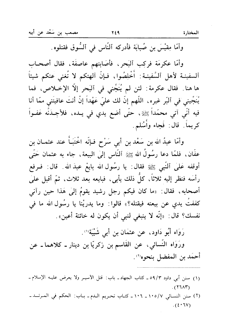 وَأَمَّا مَقِيسُ بْنُ صُبَابَةَ فَأَدْرَكَهُ النَّاسُ فِي السُّوقِ فَقَتَلُوهُ وَأَمَّا عِكْرِمَةُ فَرَكِبَ الْبَحْرَ فَأَصَابَتْهُمْ عَاصِفَةٌ فَقَالَ أَصْحَابُ السَّفِينَةُ لأَهْلِ السَّفِينَةِ أَخْلِصُوا فَإِن آلِهَتكُم لَا تغني عَنْكُم شَيْئا هَا هُنَا فَقَالَ عِكْرِمَةُ لَئِنْ لَمْ يُنَجِّنِي فِي الْبَحْرِ إِلا الإِخْلاصُ فَمَا يُنَجِّينِي فِي الْبَرِّ غَيْرُهُ اللَّهُمَّ إِنَّ لَكَ عَلَيَّ عَهْدًا إِنْ أَنْتَ عَافَيْتَنِي مِمَّا أَنَا فِيهِ أَنِّي آتِي مُحَمَّدًا صَلَّى اللَّهُ عَلَيْهِ وَسَلَّمَ حَتَّى أَضَعَ يَدِي فِي يَدِهِ فَلأَجِدَنَّهُ عَفُوًّا كَرِيمًا قَالَ فَجَاءَ وَأسلم وَأما عبد الله بْنُ سَعْدِ بْنِ أَبِي سَرْحٍ فَإِنَّهُ اخْتَبَأَ عِنْدَ عُثْمَانَ بْنِ عَفَّانَ فَلَمَّا دَعَا رَسُولُ اللَّهِ صَلَّى اللَّهُ عَلَيْهِ وَسَّلَمَ النَّاسَ إِلَى الْبَيْعَةِ جَاءَ بِهِ عُثْمَانُ حَتَّى أَوْقَفَهُ عَلَى النَّبِيَّ صَلَّى اللَّهُ عَلَيْهِ وَسَلَّمَ فَقَالَ يَا رَسُول الله بَايع عبد الله قَالَ فَرَفَعَ رَأْسَهُ فَنَظَرَ إِلَيْهِ ثَلاثًا كُلُّ ذَلِكَ يَأْبَى فَبَايَعَهُ بَعْدَ ثَلاثٍ ثُمَّ أَقْبَلَ عَلَى أَصْحَابِهِ فَقَالَ مَا كَانَ فِيكُمْ رَجُلٌ رَشِيدٌ يَقُومُ إِلَى هَذَا حِينَ رَآنِي كَفَفْتُ يَدِي عَنْ بَيْعَتِهِ فَيَقْتُلَهُ قَالُوا وَمَا يُدْرِينَا يَا رَسُولَ اللَّهِ مَا فِي نَفْسِكَ قَالَ إِنَّهُ لَا يَنْبَغِي لِنَبِيٍّ أَنْ يَكُونَ لَهُ خَائِنَةُ أَعْيُنٍ رَوَاهُ أَبُو دَاوُدَ عَنْ عُثْمَانَ بْنِ أَبِي شَيْبَةَ وَرَوَاهُ النَّسَائِيُّ عَنِ الْقَاسِمِ بْنِ زَكَرِيَّا بْنِ دِينَارٍ كِلاهُمَا عَنْ أَحْمَدَ بن الْمفضل بِنَحْوِهِ (إِسْنَاده صَحِيح)