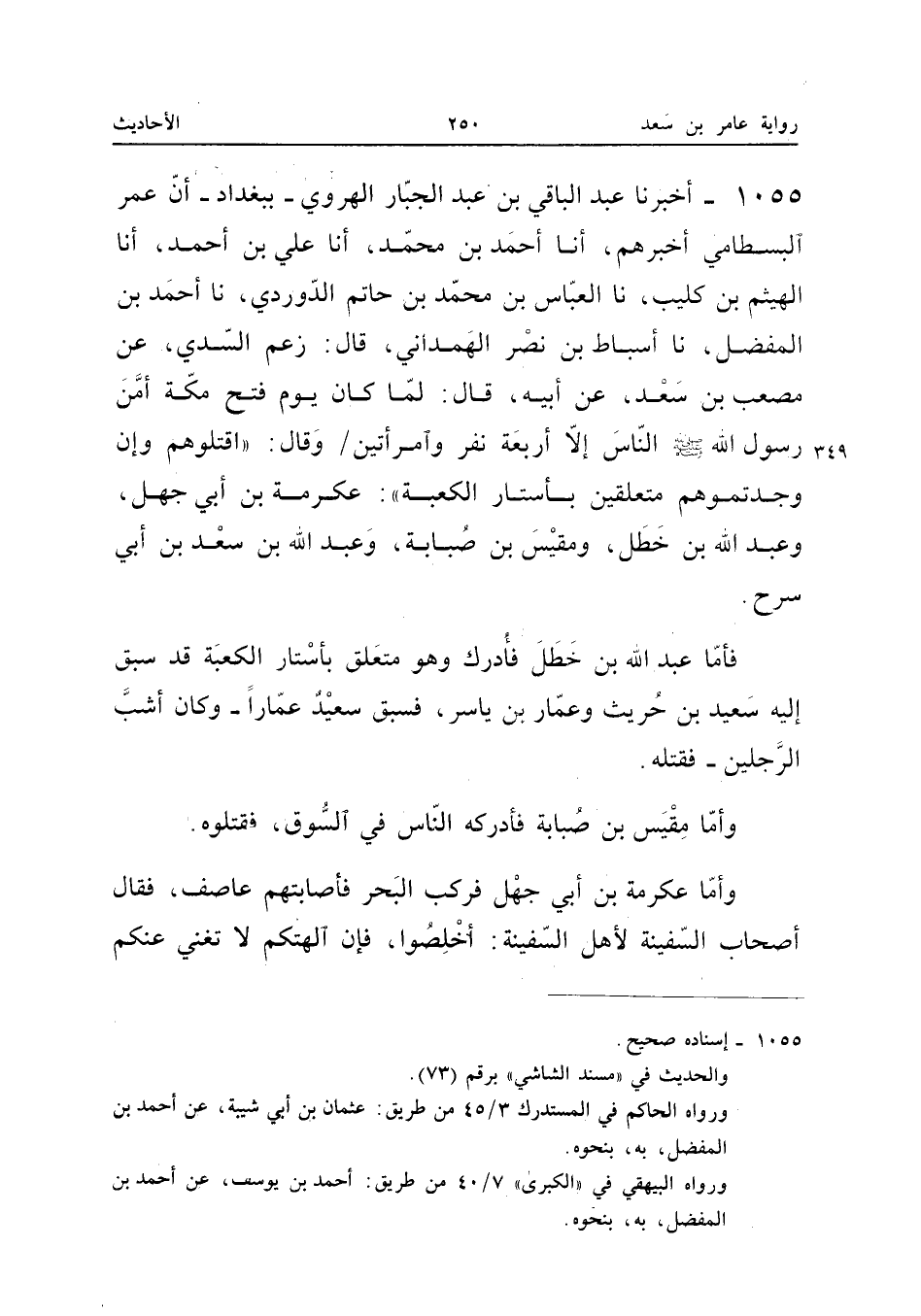 1055 - أخبرنَا عبد الْبَاقِي بن عبد الْجَبَّار الْهَرَوِيُّ بِبَغْدَادَ أَنَّ عُمَرَ الْبَسْطَامِيَّ أَخْبَرَهُمْ أَنا أَحْمَدُ بْنُ مُحَمَّدٍ أَنا عَلِيُّ بْنُ أَحْمَدَ أَنا الْهَيْثَمُ بْنُ كُلَيْبٍ نَا الْعَبَّاسُ بْنُ مُحَمَّد بن حَاتِم الدوردي نَا أَحْمَدُ بْنُ الْمُفَضَّلِ نَا أَسْبَاطُ بْنُ نَصْرٍ الْهَمْدَانِيُّ قَالَ زَعَمَ السُّدِّيُّ عَنْ مُصْعَبِ بْنِ سَعْدٍ عَنْ أَبِيهِ قَالَ لَمَّا كَانَ يَوْمُ فَتْحِ مَكَّةَ أَمَّنَ رَسُولُ اللَّهِ صَلَّى اللَّهُ عَلَيْهِ وَسَلَّمَ النَّاسَ إِلا أَرْبَعَةَ نَفَرٍ وَامْرَأَتَيْنِ وَقَالَ اقْتُلُوهُمْ وَإِنْ وَجَدْتُمُوهُمْ مُتَعَلِّقِينَ بِأَسْتَارِ الْكَعْبَة عِكْرِمَة بن أبي جهل وَعبد الله بن خطل وَمقيس بن صبَابَة وَعبد الله بن سعد بن أبي سرح فَأَما عبد الله بْنُ خَطَلٍ فَأُدْرِكَ وَهُوَ مُتَعَلِّقٌ بِأَسْتَارِ الْكَعْبَةِ قَدْ سَبَقَ إِلَيْهِ سَعِيدُ بْنُ حُرَيْثٍ وَعَمَّارُ بْنُ يَاسِرٍ فَسَبَقَ سَعِيدٌ عَمَّارًا وَكَانَ أَشَبَّ الرَّجُلَيْنِ فَقَتَلَهُ وَأَمَّا مَقِيسُ بْنُ صُبَابَةَ فَأَدْرَكَهُ النَّاسُ فِي السُّوقِ فَقَتَلُوهُ وَأَمَّا عِكْرِمَةُ بْنُ أَبِي جَهْلٍ فَرَكِبَ الْبَحْرَ فَأَصَابَتْهُمْ عَاصِفٌ فَقَالَ أَصْحَابُ السَّفِينَةُ لأَهْلِ السَّفِينَةِ أَخْلِصُوا فَإِنَّ آلِهَتَكُمْ لَا تغني عَنْكُم