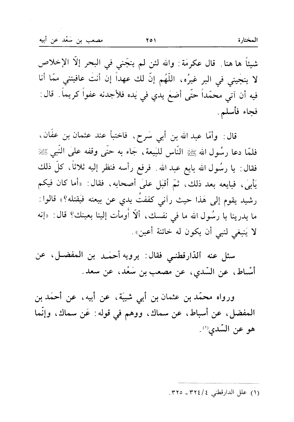 شَيْئا هَا هُنَا قَالَ عِكْرِمَةُ وَاللَّهِ لَئِنْ لَمْ يُنَجِّنِي فِي الْبَحْرِ إِلا الإِخْلاصُ لَا يُنَجِّينِي فِي الْبَرِّ غَيْرُهُ اللَّهُمَّ إِنَّ لَكَ عَهْدًا إِنْ أَنْتَ عَافَيْتَنِي مِمَّا أَنَا فِيهِ أَنْ آتِيَ مُحَمَّدًا حَتَّى أَضَعَ يَدِي فِي يَدِهِ فَلأَجِدَنَّهُ عَفُوًّا كَرِيمًا قَالَ فجَاء فَأسلم قَالَ وَأما عبد الله بْنُ أَبِي سَرْحٍ فَاخْتَبَأَ عِنْدَ عُثْمَانَ بْنِ عَفَّانَ فَلَمَّا دَعَا رَسُولُ اللَّهِ صَلَّى اللَّهُ عَلَيْهِ وَسَلَّمَ النَّاسَ لِلْبَيْعَةِ جَاءَ بِهِ حَتَّى وَقَّفَهُ عَلَى النَّبِيِّ صَلَّى اللَّهُ عَلَيْهِ وَسَلَّمَ فَقَالَ يَا رَسُول الله بَايع عبد الله فَرَفَعَ رَأْسَهُ فَنَظَرَ إِلَيْهِ ثَلاثًا كُلُّ ذَلِكَ يَأْبَى فَبَايَعَهُ بَعْدَ ذَلِكَ ثُمَّ أَقْبَلَ عَلَى أَصْحَابِهِ فَقَالَ أَمَا كَانَ فِيكُمْ رَشِيدٌ يَقُومُ إِلَى هَذَا حَيْثُ رَآنِي كَفَفْتُ يَدِي عَنْ بَيْعَتِهِ فَيَقْتُلَهُ قَالُوا مَا يُدْرِينَا يَا رَسُولَ اللَّهِ مَا فِي نَفْسِكَ أَلا أَوْمَأْتَ إِلَيْنَا بِعَيْنِكَ قَالَ إِنَّهُ لَا يَنْبَغِي لِنَبِيٍّ أَنْ يَكُونَ لَهُ خَائِنَةُ أَعْيُنٍ سُئِلَ عَنْهُ الدَّارَقُطْنِيُّ فَقَالَ يَرْوِيهِ أَحْمَدُ بْنُ الْمُفَضَّلِ عَنْ أَسْبَاطٍ عَنِ السُّدِّيِّ عَنْ مُصْعَبِ بْنِ سَعْدٍ عَنْ سَعْدٍ وَرَوَاهُ مُحَمَّدُ بْنُ عُثْمَانَ بْنِ أَبِي شَيْبَةَ عَنْ أَبِيهِ عَنْ أَحْمَدَ بْنِ الْمُفَضَّلِ عَنْ أَسْبَاطٍ عَنْ سِمَاكٍ وَوَهِمَ فِي قَوْلِهِ عَن سماك وَإِنَّمَا هُوَ عَن السّديّ (إِسْنَاده صَحِيح)