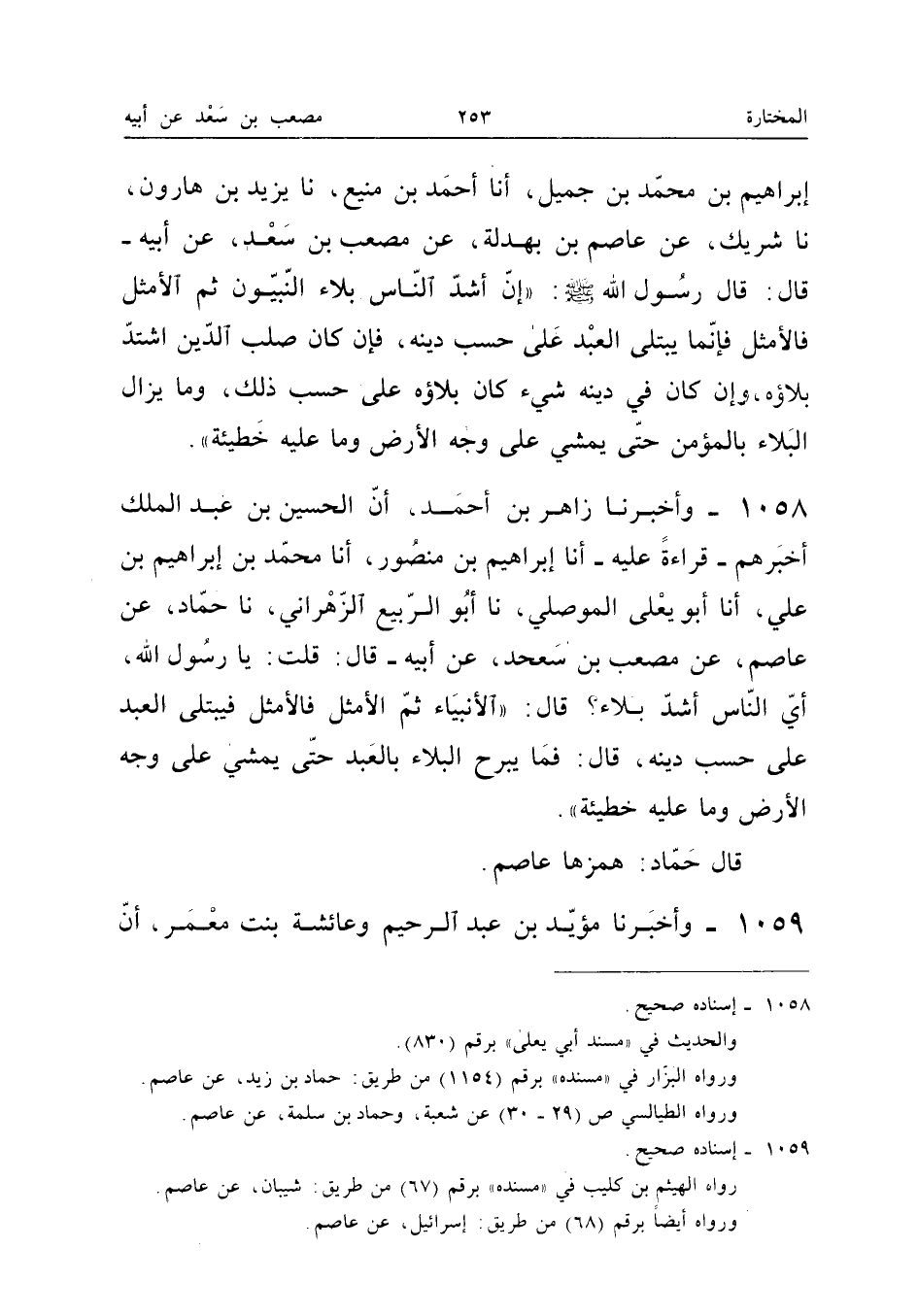 1058 - وَأَخْبَرَنَا زَاهِرُ بْنُ أَحْمَدَ أَنَّ الْحُسَيْنَ بْنَ عبد الْملك أَخْبَرَهُمْ قِرَاءَةً عَلَيْهِ أَنا إِبْرَاهِيمُ بْنُ مَنْصُورٍ أَنَا مُحَمَّدُ بْنُ إِبْرَاهِيمَ بْنِ عَلِيٍّ أَنَا أَبُو يَعْلَى الْمَوْصِلِيُّ نَا أَبُو الرَّبِيعِ الزَّهْرَانِيُّ نَا حَمَّادٌ عَنْ عَاصِمٍ عَنْ مُصْعَبِ بْنِ سَعْدٍ عَنْ أَبِيهِ قَالَ قُلْتُ يَا رَسُولَ اللَّهِ أَيُّ النَّاسِ أَشَدُّ بَلاءً قَالَ الأَنْبِيَاءُ ثُمَّ الأَمْثَلُ فَالأَمْثَلُ فَيُبْتَلَى الْعَبْدُ عَلَى حَسَبِ دِينِهِ قَالَ فَمَا يَبْرَحُ الْبَلاءُ بِالْعَبْدِ حَتَّى يَمْشِيَ عَلَى وَجْهِ الأَرْضِ وَمَا عَلَيْهِ خَطِيئَةٌ قَالَ حَمَّاد همزها عَاصِم (إِسْنَاده صَحِيح)
