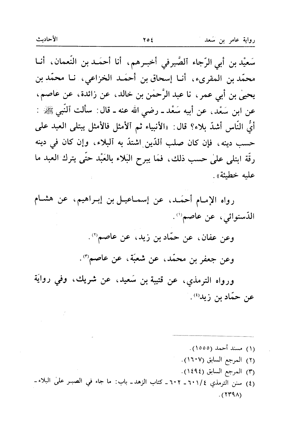 سَعِيدَ بْنَ أَبِي الرَّجَاءِ الصَّيْرَفِيَّ أَخْبَرَهُمْ أَنَا أَحْمد بن النُّعْمَان أَنا مُحَمَّد بن الْمُقْرِئِ أَنا إِسْحَاقُ بْنُ أَحْمَدَ الْخُزَاعِيُّ نَا مُحَمَّدُ بْنُ يَحْيَى بْنِ أَبِي عُمَرَ نَا عبد الرَّحْمَن بْنُ خَالِدٍ عَنْ زَائِدَةَ عَنْ عَاصِمٍ عَنِ ابْنِ سَعْدٍ عَنْ أَبِيهِ سَعْدٍ رَضِيَ اللَّهُ عَنْهُ قَالَ سَأَلْتُ النَّبِيَّ صَلَّى اللَّهُ عَلَيْهِ وَسَلَّمَ أَيُّ النَّاسِ أَشَدُّ بَلاءً قَالَ الأَنْبِيَاءُ ثُمَّ الأَمْثَلُ فَالأَمْثَلُ يُبْتَلَى الْعَبْدُ عَلَى حَسَبِ دِينِهِ فَإِنْ كَانَ صُلْبَ الدِّينِ اشْتَدَّ بِهِ الْبَلاءُ وَإِنْ كَانَ فِي دِينِهِ رِقَّةٌ ابْتُلِيَ عَلَى حَسَبِ ذَلِكَ فَمَا يَبْرَحُ الْبَلاءُ بِالْعَبْدِ حَتَّى يَتْرُكَ الْعَبْدَ مَا عَلَيْهِ خَطِيئَةٌ رَوَاهُ الإِمَامُ أَحْمَدُ عَنْ إِسْمَاعِيلَ بْنِ إِبْرَاهِيمَ عَنْ هِشَامٍ الدَّسْتُوَائِيِّ عَنْ عَاصِمٍ وَعَنْ عَفَّانَ عَنْ حَمَّادِ بْنِ زَيْدٍ عَنْ عَاصِمٍ وَعَنْ جَعْفَرِ بْنِ مُحَمَّدٍ عَنْ شُعْبَةَ عَنْ عَاصِمٍ وَرَوَاهُ التِّرْمِذِيُّ عَنْ قُتَيْبَةَ بْنِ سَعِيدٍ عَنْ شَرِيكٍ وَفِي رِوَايَةٍ عَنْ حَمَّادِ بْنِ زَيْدٍ