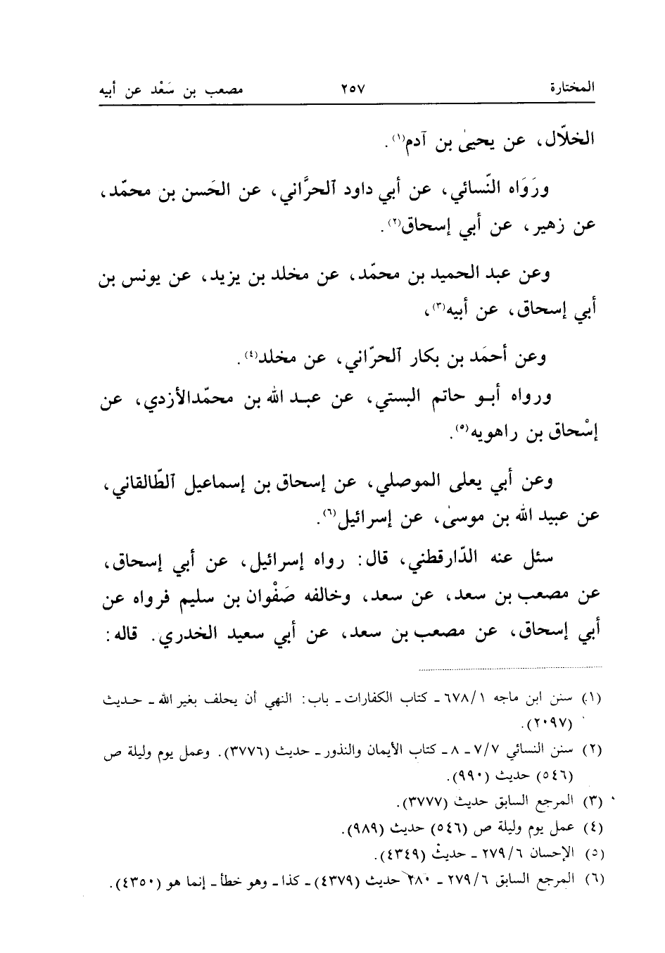 الْخَلالِ عَنْ يَحْيَى بْنِ آدَمَ وَرَوَاهُ النَّسَائِيُّ عَنْ أَبِي دَاوُدَ الْحَرَّانِيِّ عَنِ الْحَسَنِ بْنِ مُحَمَّدٍ عَنْ زُهَيْرٍ عَنْ أَبِي إِسْحَاقَ وَعَنْ عبد الحميد بْنِ مُحَمَّدٍ عَنْ مَخْلَدِ بْنِ يَزِيدَ عَنْ يُونُسَ بْنِ أَبِي إِسْحَاقَ عَنْ أَبِيهِ وَعَنْ أَحْمَدِ بْنِ بَكَّارٍ الْحَرَّانِيِّ عَنْ مَخْلَدٍ وَرَوَاهُ أَبُو حَاتِم البستي عَن عبد الله بْنِ مُحَمَّدٍ الأَزْدِيِّ عَنْ إِسْحَاقَ بْنِ رَاهُوَيْهِ وَعَنْ أَبِي يَعْلَى الْمَوْصِلِيِّ عَنْ إِسْحَاقَ بْنِ إِسْمَاعِيل الطَّالقَانِي عَن عبيد الله بْنِ مُوسَى عَنْ إِسْرَائِيلَ سُئِلَ عَنْهُ الدَّارَقُطْنِيُّ قَالَ رَوَاهُ إِسْرَائِيلُ عَنْ أَبِي إِسْحَاقَ عَنْ مُصْعَبِ بْنِ سَعْدٍ عَنْ سَعْدٍ وَخَالَفَهُ صَفْوَانُ بْنُ سُلَيْمٍ فَرَوَاهُ عَنْ أَبِي إِسْحَاقَ عَنْ مُصْعَبِ بْنِ سَعْدٍ عَنْ أَبِي سَعِيدٍ الْخُدْرِيِّ قَالَه
