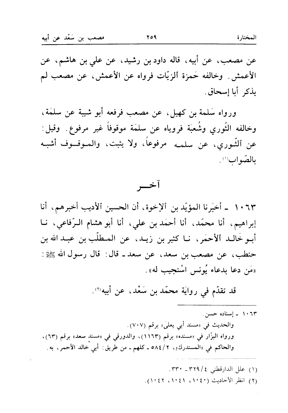 1063 - أخبرنَا الْمُؤَيد بن الإِخوةِ أَنَّ الْحُسَيْنَ الأَدِيبَ أَخْبَرَهُمْ أَنا إِبْرَاهِيمُ أَنا مُحَمَّدٌ أَنا أَحْمَدُ بْنُ عَلِيٍّ أَنا أَبُو هِشَامٍ الرِّفَاعِيُّ نَا أَبُو خَالِدٍ الأَحْمَرُ نَا كَثِيرُ بْنُ زَيْدٍ عَنِ الْمُطَّلِبِ بْنِ عبد الله بْنِ حَنْطَبٍ عَنْ مُصْعَبِ بْنِ سَعْدٍ عَنْ سَعْدٍ قَالَ قَالَ رَسُولُ اللَّهِ صَلَّى اللَّهُ عَلَيْهِ وَسَلَّمَ مَنْ دَعَا بِدُعَاءِ يُونُسَ اسْتُجِيبَ لَهُ قَدْ تَقَدَّمَ فِي رِوَايَةِ مُحَمَّدِ بْنِ سَعْدٍ عَنْ أَبِيهِ كَثِيرٌ تَكَلَّمَ فِيهِ بَعْضُهُمْ ومدحه بَعضهم (إِسْنَاده حسن)