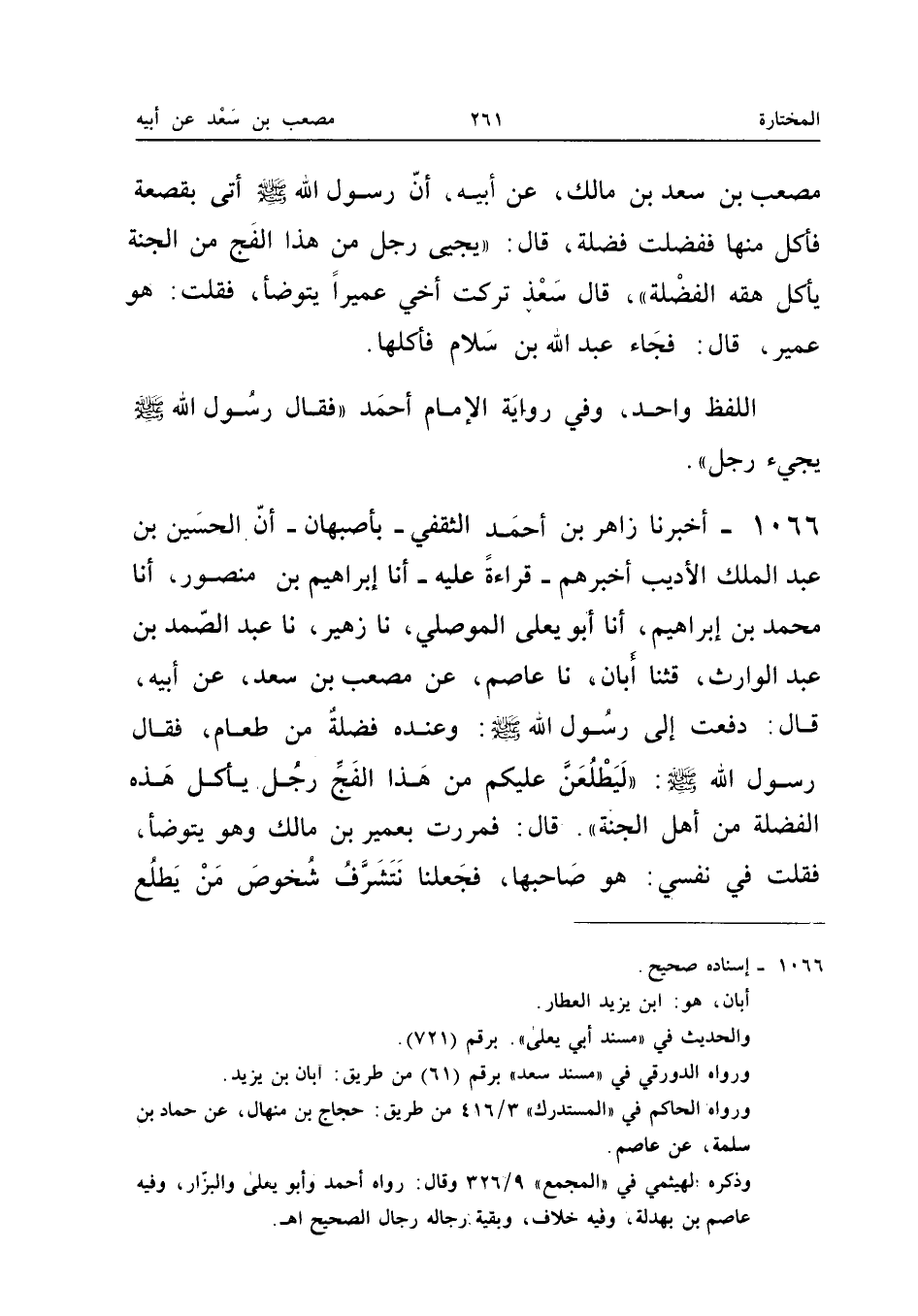 1066 - أَخْبَرَنَا زَاهِرُ بْنُ أَحْمَدَ الثَّقَفِيُّ بِأَصْبَهَانَ أَنَّ الْحُسَيْن بن عبد الْملك الأَدِيبَ أَخْبَرَهُمْ قِرَاءَةً عَلَيْهِ أَنا إِبْرَاهِيمُ بْنُ مَنْصُورٍ أَنا مُحَمَّدُ بْنُ إِبْرَاهِيمَ أَنا أَبُو يعلى الْموصِلِي نَا زُهَيْر نَا عبد الصَّمد بن عبد الْوَارِث قثنا أَبَانٌ نَا عَاصِمٌ عَنْ مُصْعَبِ بْنِ سَعْدٍ عَنْ أَبِيهِ قَالَ دَفَعْتُ إِلَى رَسُولِ اللَّهِ صَلَّى اللَّهُ عَلَيْهِ وَسَلَّمَ وَعِنْدَهُ فَضْلَةٌ مِنْ طَعَامٍ فَقَالَ رَسُولُ اللَّهِ صَلَّى اللَّهُ عَلَيْهِ وَسَلَّمَ لَيَطْلَعَنَّ عَلَيْكُمْ مِنْ هَذَا الْفَجِّ رَجُلٌ يَأْكُلُ هَذِهِ الْفَضْلَةَ مِنْ أَهْلِ الْجَنَّةِ قَالَ فَمَرَرْتُ بِعُمَيْرِ بْنِ مَالِكٍ وَهُوَ يَتَوَضَّأُ فَقُلْتُ فِي نَفْسِي هُوَ صَاحِبُهَا فَجَعَلْنَا نَتَشَرَّفُ شخوص من يطلع