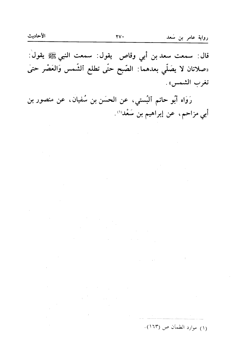 قَالَ سَمِعْتُ سَعْدَ بْنَ أَبِي وَقَّاصٍ يَقُولُ سَمِعْتُ النَّبِيَّ صَلَّى اللَّهُ عَلَيْهِ وَسَلَّمَ يَقُولُ صَلاتَانِ لَا يُصَلَّى بَعْدَهُمَا الصُّبْحُ حَتَّى تَطْلُعَ الشَّمْسُ وَالْعَصْرُ حَتَّى تَغْرُبَ الشَّمْسُ رَوَاهُ أَبُو حَاتِمٍ الْبُسْتِيُّ عَنِ الْحَسَنِ بْنِ سُفْيَانَ عَنْ مَنْصُورِ بْنِ أَبِي مُزَاحِمٍ عَنْ إِبْرَاهِيمَ بن سعد (إِسْنَاده حسن)