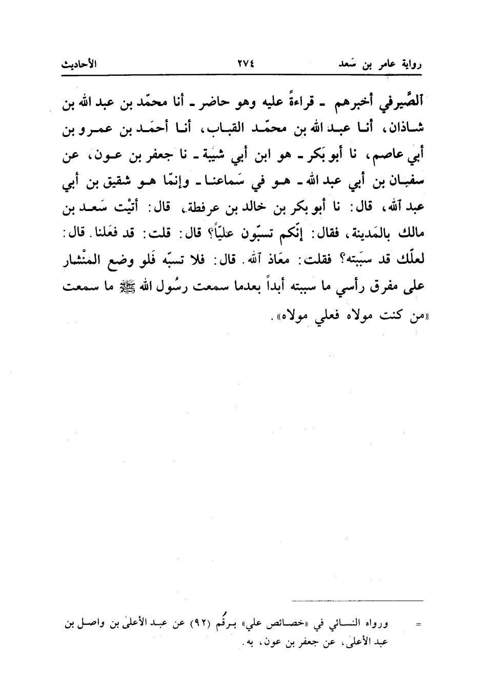 الصَّيْرَفِيَّ أَخْبَرَهُمْ قِرَاءَةً عَلَيْهِ وَهُوَ حَاضِرٌ أَنا مُحَمَّد بن عبد الله بن شَاذان أَنا عبد الله بن محمدالقباب أَنا أَحْمَدُ بْنُ عَمْرِو بْنِ أَبِي عَاصِمٍ نَا أَبُو بَكْرٍ هُوَ ابْنُ أَبِي شَيْبَةَ نَا جَعْفَرُ بْنُ عَوْنٍ عَنْ سُفْيَانَ بْنِ أبي عبد الله هُوَ فِي سَمَاعِنَا وَإِنَّمَا هُوَ شَقِيقُ بْنُ أبي عبد الله قَالَ نَا أَبُو بَكْرِ بْنُ خَالِدِ بْنِ عُرْفُطَةَ قَالَ أَتَيْتُ سَعْدَ بْنَ مَالِكٍ بِالْمَدِينَةِ فَقَالَ إِنَّكُمْ تَسُبُّونَ عَلِيًّا قَالَ قُلْتُ قَدْ فَعَلْنَا قَالَ لَعَلَّكَ قَدْ سَبَبْتَهُ فَقُلْتُ مَعَاذَ اللَّهِ قَالَ فَلا تَسُبَّهُ فَلَوْ وُضِعَ الْمِنْشَارُ على مفرق رَأْسِي مَا سببته أبدا بَعْدَمَا سَمِعْتُ رَسُولَ اللَّهِ صَلَّى اللَّهُ عَلَيْهِ وَسَلَّمَ مَا سَمِعْتُ مَنْ كُنْتُ مَوْلاهُ فَعَلِيٌّ مَوْلاهُ (إِسْنَاده حسن)