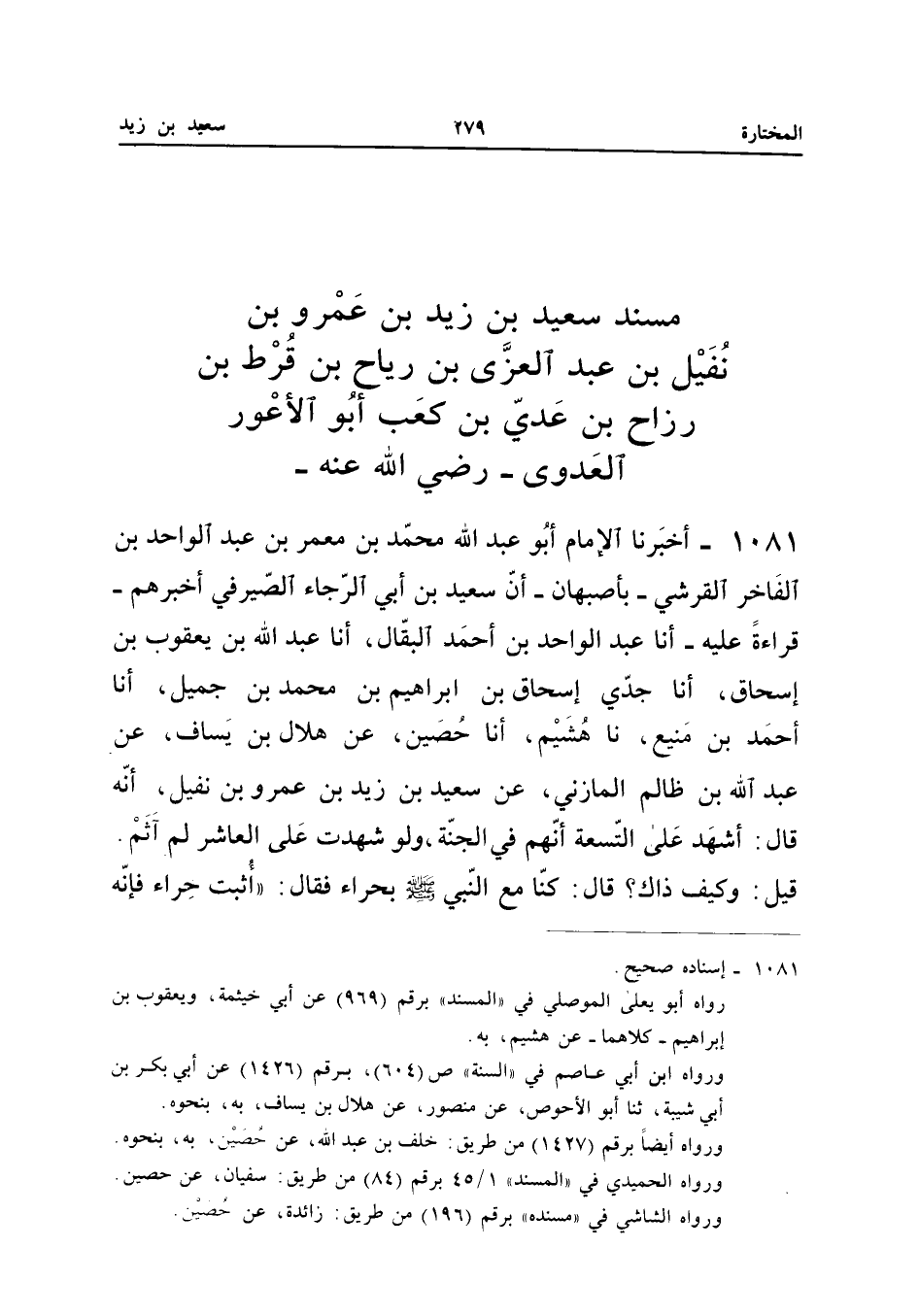 1081 - أخبرنَا الإِمَام أَبُو عبد الله مُحَمَّد بن معمر بن عبد الْوَاحِد بْنِ الْفَاخِرِ الْقُرَشِيُّ بِأَصْبَهَانَ أَنَّ سَعِيدَ بْنَ أَبِي الرَّجَاءِ الصَّيْرَفِيَّ أَخْبَرَهُمْ قِرَاءَةً عَلَيْهِ أَنا عبد الْوَاحِد بن أَحْمد الْبَقَّال أَنا عبد الله بْنُ يَعْقُوبَ بْنِ إِسْحَاقَ أَنا جَدِّي إِسْحَاقُ بْنُ إِبْرَاهِيمَ بْنِ مُحَمَّدِ بْنِ جَمِيلٍ أَنا أَحْمَدُ بْنُ مَنِيعٍ نَا هُشَيْمٌ أَنا حُصَيْنٌ عَن هِلَال بن يسَاف عَن عبد الله بْنِ ظَالِمٍ الْمَازِنِيِّ عَنْ سَعِيدِ بْنِ زَيْدِ بْنِ عَمْرِو بْنِ نُفَيْلٍ أَنَّهُ قَالَ أَشْهَدُ عَلَى التِّسْعَةِ أَنَّهُمْ فِي الْجَنَّةِ وَلَوْ شَهِدْتُ عَلَى الْعَاشِرِ لَمْ آثَمْ قِيلَ وَكَيْفَ ذَاكَ قَالَ كُنَّا مَعَ النَّبِيِّ صَلَّى اللَّهُ عَلَيْهِ وَسَلَّمَ بِحِرَاءٍ فَقَالَ اثْبُتْ حِرَاءُ فَإِنَّهُ