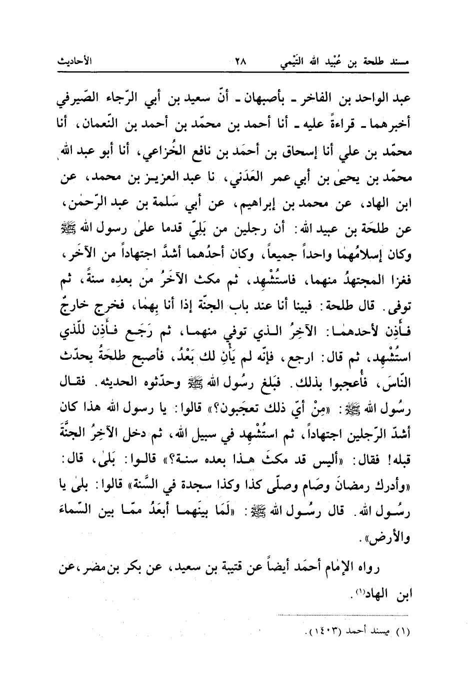 عبد الْوَاحِد بْنِ الْفَاخِرِ بِأَصْبَهَانَ أَنَّ سَعِيدَ بْنَ أَبِي الرَّجَاءِ الصَّيْرَفِيَّ أَخْبَرَهُمَا قِرَاءَةً عَلَيْهِ أَنا أَحْمَدُ بْنُ مُحَمَّدِ بْنِ أَحْمَدَ بْنِ النُّعْمَانِ أَنا مُحَمَّدُ بْنُ عَلِيٍّ أَنا إِسْحَاقُ بْنُ أَحْمَدَ بن نَافِع الْخُزَاعِيّ أَنا أَبُو عبد الله مُحَمَّدُ بْنُ يَحْيَى بْنِ أَبِي عُمَرَ الْعَدَنِيُّ نَا عبد الْعَزِيز بْنُ مُحَمَّدٍ عَنِ ابْنِ الْهَادِ عَنْ مُحَمَّدِ بن إِبْرَاهِيم عَن أبي سَلمَة بن عبد الرَّحْمَن عَن طَلْحَة بن عبيد الله أَنَّ رَجُلَيْنِ مِنْ بُلَيٍّ قَدِمَا عَلَى رَسُولِ اللَّهِ صَلَّى اللَّهُ عَلَيْهِ وَسَلَّمَ وَكَانَ إِسْلامُهُمَا وَاحِدًا جَمِيعًا وَكَانَ أَحَدُهُمَا أَشَدَّ اجْتِهَادًا مِنَ الآخَرِ فَغَزَا الْمُجْتَهِدُ مِنْهُمَا فَاسْتُشْهِدَ ثُمَّ مَكَثَ الآخَرُ مِنْ بَعْدِهِ سَنَةً ثُمَّ تُوُفِّيَ قَالَ طَلْحَةُ فَبَيْنَا أَنَا عِنْدَ بَابِ الْجَنَّةِ إِذَا أَنَا بِهِمَا فَخَرَجَ خَارِجٌ فَأَذِنَ لأَحَدِهِمَا الآخَرِ الَّذِي تُوُفِّيَ مِنْهُمَا ثُمَّ رَجَعَ فَأَذِنَ لِلَّذِي اسْتُشْهِدَ ثُمَّ قَالَ ارْجِعْ فَإِنَّهُ لَمْ يَأْنِ لَكَ بَعْدُ فَأَصْبَحَ طَلْحَةُ يُحَدِّثُ النَّاسَ فَأُعْجِبُوا بِذَلِكَ فَبَلَغَ رَسُولُ اللَّهِ صَلَّى اللَّهُ عَلَيْهِ وَسلم وحدثوه الحديثة فَقَالَ رَسُولُ اللَّهِ صَلَّى اللَّهُ عَلَيْهِ وَسَلَّمَ مِنْ أَيِّ ذَلِكَ تَعْجَبُونَ قَالُوا يَا رَسُولَ اللَّهِ هَذَا كَانَ أَشَدَّ الرَّجُلَيْنِ اجْتِهَادًا ثُمَّ اسْتُشْهِدَ فِي سَبِيلِ اللَّهِ ثُمَّ دَخَلَ الآخَرُ الْجَنَّةَ قَبْلَهُ فَقَالَ أَلَيْسَ قَدْ مَكَثَ هَذَا بَعْدَهُ سَنَةً قَالُوا بَلَى قَالَ وَأَدْرَكَ رَمَضَانَ وَصَامَ وَصَلَّى كَذَا وَكَذَا سَجْدَةٍ فِي السَّنَةِ قَالُوا بَلَى يَا رَسُولَ اللَّهِ قَالَ رَسُولُ اللَّهِ صَلَّى اللَّهُ عَلَيْهِ وَسَلَّمَ لِمَا بَيْنَهُمَا أَبْعَدُ مِمَّا بَيْنَ السَّمَاءِ وَالأَرْضِ رَوَاهُ الإِمَامُ أَحْمَدُ أَيْضًا عَنْ قُتَيْبَةَ بْنِ سَعِيدٍ عَنْ بَكْرِ بْنِ مُضَرَ عَنِ ابْنِ الْهَادِ