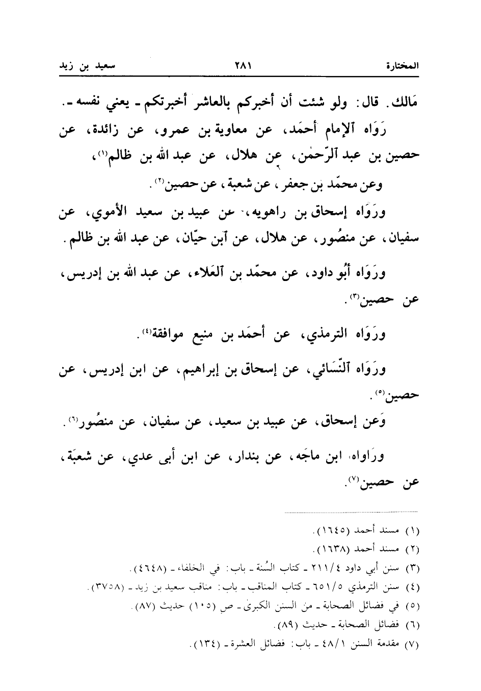 مَالِكٍ قَالَ وَلَوْ شِئْتُ أَنْ أُخْبِرَكُمْ بِالْعَاشِرِ أَخْبَرْتُكُمْ يَعْنِي نَفْسَهُ رَوَاهُ الإِمَامُ أَحْمَدُ عَنْ مُعَاوِيَةَ بْنِ عَمْرٍو عَنْ زَائِدَةَ عَنْ حُصَيْنِ بن عبد الرَّحْمَن عَن هِلَال عَن عبد الله بْنِ ظَالِمٍ وَعَنْ مُحَمَّدِ بْنِ جَعْفَرٍ عَنْ شُعْبَةَ عَنْ حُصَيْنٍ وَرَوَاهُ إِسْحَاقُ بْنُ رَاهُوَيْهِ عَنْ عُبَيْدِ بْنِ سَعِيدٍ الأُمَوِيِّ عَنْ سُفْيَانَ عَنْ مَنْصُورٍ عَنْ هِلالٍ عَنِ ابْنِ حَيَّانَ عَن عبد الله بْنِ ظَالِمٍ وَرَوَاهُ أَبُو دَاوُدَ عَنْ مُحَمَّدِ بن الْعَلَاء عَن عبد الله بْنِ إِدْرِيسَ عَنْ حُصَيْنٍ وَرَوَاهُ التِّرْمِذِيُّ عَنْ أَحْمَدَ بْنِ مَنِيعٍ مُوَافَقَةً وَرَوَاهُ النَّسَائِيُّ عَنْ إِسْحَاقَ بْنِ إِبْرَاهِيمَ عَنِ ابْنِ إِدْرِيسَ عَنْ حُصَيْنٍ وَعَنْ إِسْحَاقَ عَنْ عُبَيْدِ بْنِ سَعِيدٍ عَنْ سُفْيَانَ عَنْ مَنْصُورٍ وَرَوَاهُ ابْنُ مَاجَهْ عَنْ بُنْدَارٍ عَنِ ابْنِ أَبِي عَدِيٍّ عَنْ شُعْبَة عَن حُصَيْن (إِسْنَاده صَحِيح)
