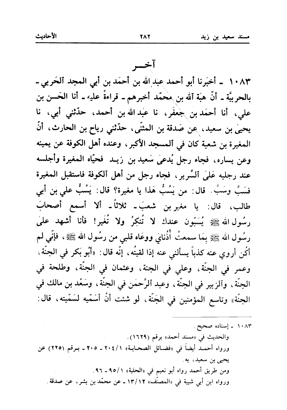 1083 - أخبرنَا أَبُو أَحْمد عبد الله بْنُ أَحْمَدَ بْنِ أَبِي الْمَجْدِ الْحَرْبِيُّ بِالْحَرْبِيَّةِ أَنَّ هِبَةَ اللَّهِ بْنَ مُحَمَّدٍ أَخْبَرَهُمْ قِرَاءَةً عَلَيْهِ أَنا الْحَسَنُ بْنُ عَلِيٍّ أَنا أَحْمَدُ بن جَعْفَر نَا عبد الله بْنُ أَحْمَدَ حَدَّثَنِي أَبِي نَا يَحْيَى بْنُ سَعِيدٍ عَنْ صَدَقَةَ بْنِ الْمُثَنَّى حَدَّثَنِي رِيَاحُ بْنُ الْحَارِثِ أَنَّ الْمُغِيرَةَ بْنَ شُعْبَةَ كَانَ فِي الْمَسْجِدِ الأَكْبَرِ وَعِنْدَهُ أَهْلُ الْكُوفَةِ عَنْ يَمِينِهِ وَعَنْ يَسَارِهِ فَجَاءَ رَجُلٌ يُدْعَى سَعِيدَ بْنَ زَيْدٍ فَحَيَّاهُ الْمُغِيرَةُ وَأَجْلَسَهُ عِنْدَ رِجْلَيْهِ عَلَى السَّرِيرِ فَجَاءَ رَجُلٌ مِنْ أَهْلِ الْكُوفَةِ فَاسْتَقْبَلَ الْمُغِيرَةَ فَسَبَّ وَسَبَّ قَالَ مَنْ يَسُبُّ هَذَا يَا مُغِيرَةُ قَالَ يَسُبُّ عَلِيَّ بْنَ أَبِي طَالِبٍ قَالَ يَا مُغِيرَ بْنُ شُعْبَ ثَلاثًا أَلا أَسْمَعُ أَصْحَابَ رَسُولُ اللَّهِ صَلَّى اللَّهُ عَلَيْهِ وَسَلَّمَ يُسَبُّونَ عِنْدَكَ لَا تُنْكِرُ وَلا تُغَيِّرُ فَأَنَا أَشْهَدُ عَلَى رَسُولِ اللَّهِ صَلَّى اللَّهُ عَلَيْهِ وَسَلَّمَ بِمَا سَمِعَتْ أُذُنَايَ وَوَعَاهُ قَلْبِي مِنْ رَسُولِ اللَّهِ صَلَّى اللَّهُ عَلَيْهِ وَسَلَّمَ فَإِنِّي لَمْ أَكُنْ أَرْوِي عَنْهُ كَذِبًا يَسْأَلُنِي عَنْهُ إِذَا لَقِيتُهُ إِنَّهُ قَالَ أَبُو بَكْرٍ فِي الْجَنَّةِ وَعُمَرُ فِي الْجَنَّةِ وَعَلِيٌّ فِي الْجَنَّةِ وَعُثْمَانُ فِي الْجَنَّةِ وَطَلْحَةُ فِي الْجنَّة وَالزُّبَيْر فِي الْجنَّة وَعبد الرَّحْمَن فِي الْجَنَّةِ وَسَعْدُ بْنُ مَالِكٍ فِي الْجَنَّةِ وَتَاسِعُ الْمُؤْمِنِينَ فِي الْجَنَّةِ لَوْ شِئْتُ أَنْ أُسَمِّيَهُ لَسَمَّيْتُهُ قَالَ