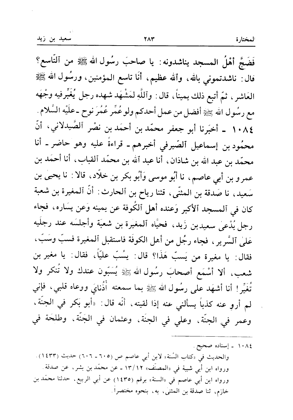 1084 - أَخْبَرَنَا أَبُو جَعْفَرٍ مُحَمَّدُ بْنُ أَحْمَدَ بْنِ نَصْرٍ الصَّيْدَلانِيُّ أَنَّ مَحْمُودَ بْنَ إِسْمَاعِيلَ الصَّيْرَفِيَّ أَخْبَرَهُمْ قِرَاءَةً عَلَيْهِ وَهُوَ حَاضِرٌ أَنا مُحَمَّدُ بن عبد الله بن شَاذان أَنا عبد الله بْنُ مُحَمَّدٍ الْقَبَّابُ أَنا أَحْمَدُ بْنُ عَمْرِو بْنِ أَبِي عَاصِمٍ نَا أَبُو مُوسَى وَأَبُو بَكْرِ بْنُ خَلادٍ قَالا نَا يَحْيَى بْنُ سَعِيدٍ نَا صَدَقَةُ بْنُ الْمُثَنَّى قثنا رِيَاحُ بْنُ الْحَارِثِ أَنَّ الْمُغِيرَةَ بْنَ شُعْبَةَ كَانَ فِي الْمَسْجِدِ الأَكْبَرِ وَعِنْدَهُ أَهْلُ الْكُوفَةِ عَنْ يَمِينِهِ وَعَنْ يَسَارِهِ فَجَاءَ رَجُلٌ يُدْعَى سَعِيدَ بْنَ زَيْدٍ فَحَيَّاهُ الْمُغِيرَةُ بْنُ شُعْبَةَ وَأَجْلَسَهُ عِنْدَ رِجْلَيْهِ عَلَى السَّرِيرِ فَجَاءَ رَجُلٌ مِنْ أَهْلِ الْكُوفَةِ فَاسْتَقْبَلَ الْمُغِيرَةَ فَسَبَّ وَسَبَّ فَقَالَ يَا مَغُيرَةُ مَنْ يَسُبُّ هَذَا قَالَ يَسُبُّ عَلِيًّا فَقَالَ يَا مُغِيرَ بْنُ شُعْبَ أَلا أَسْمَعُ أَصْحَابَ رَسُولُ اللَّهِ صَلَّى اللَّهُ عَلَيْهِ وَسَلَّمَ يُسَبُّونَ عِنْدَكَ وَلا تُنْكِرُ وَلا تُغَيِّرُ أَنَا أَشْهَدُ عَلَى رَسُولِ اللَّهِ صَلَّى اللَّهُ عَلَيْهِ وَسَلَّمَ بِمَا سَمِعَتْهُ أُذُنَايَ وَوَعَاهُ قَلْبِي فَإِنِّي لَمْ أَرْوِ عَنْهُ كَذِبًا يَسْأَلُنِي عَنْهُ إِذَا لَقِيتُهُ إِنَّهُ قَالَ أَبُو بَكْرٍ فِي الْجَنَّةِ وَعُمَرُ فِي الْجَنَّةِ وَعَلِيٌّ فِي الْجَنَّةِ وَعُثْمَانُ فِي الْجَنَّةِ وَطَلْحَةُ فِي