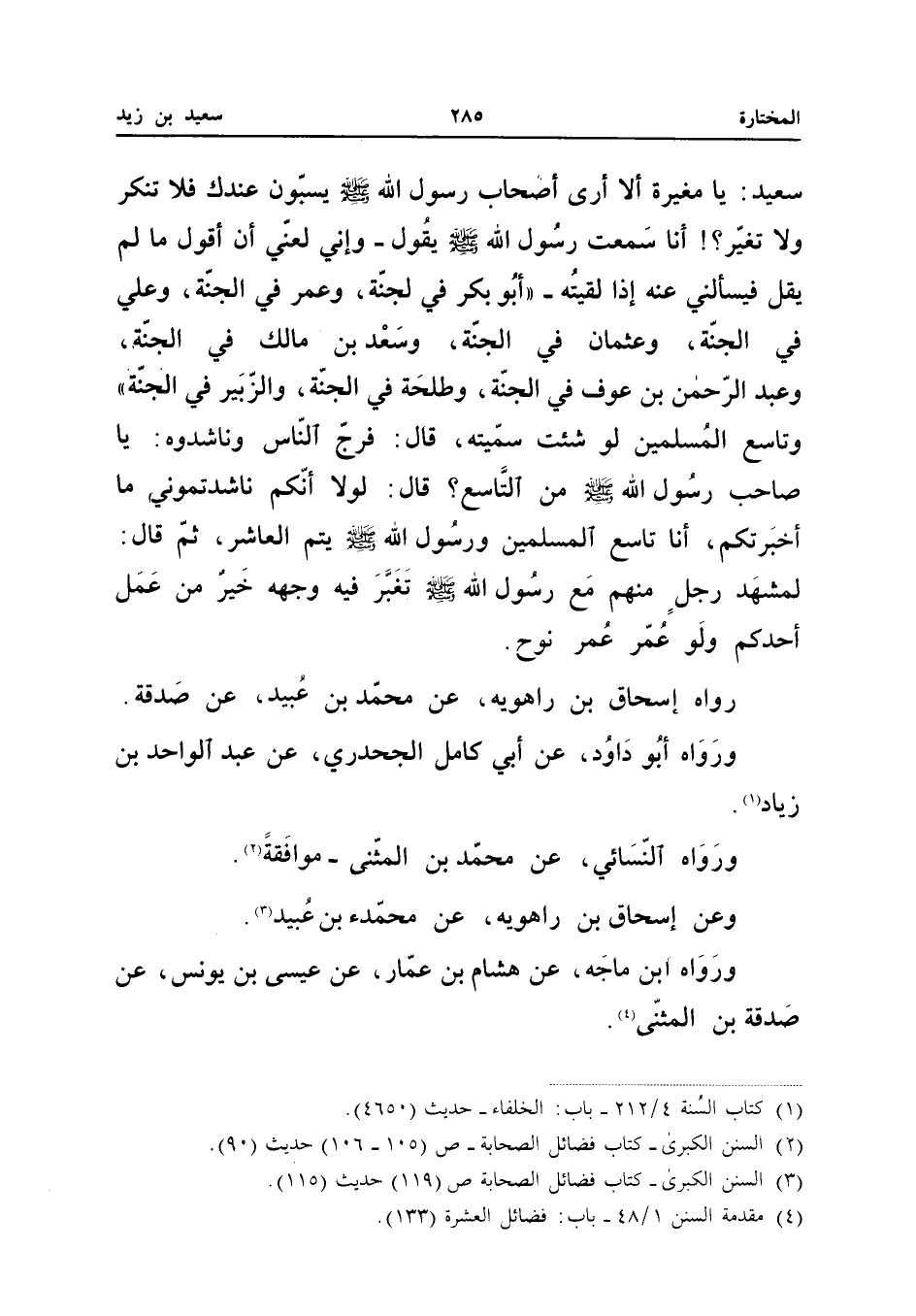 سَعِيدٌ يَا مُغِيرَةُ أَلا أَرَى أَصْحَابَ رَسُولِ اللَّهِ صَلَّى اللَّهُ عَلَيْهِ وَسَلَّمَ يُسَبُّونَ عِنْدَكَ فَلا تُنْكِرُ وَلا تُغَيِّرُ أَنَا سَمِعْتُ رَسُولَ اللَّهِ صَلَّى اللَّهُ عَلَيْهِ وَسَلَّمَ يَقُولُ وَإِنِّي لَغَنِيٌّ أَنْ أَقُولَ مَا لَمْ يَقُلْ فَيَسْأَلُنِي عَنْهُ إِذَا لَقِيتُهُ أَبُو بَكْرٍ فِي الْجَنَّةِ وَعُمَرُ فِي الْجَنَّةِ وَعَلِيٌّ فِي الْجَنَّةِ وَعُثْمَانُ فِي الْجَنَّةِ وَسَعْدُ بْنُ مَالِكٍ فِي الْجَنَّةِ وَعبد الرَّحْمَن بْنُ عَوْفٍ فِي الْجَنَّةِ وَطَلْحَةُ فِي الْجَنَّةِ وَالزُّبَيْرُ فِي الْجَنَّةِ وَتَاسِعُ الْمُسْلِمِينَ لَوْ شِئْتُ سَمَّيْتُهُ قَالَ فَرَجَّ النَّاسُ وَنَاشَدُوهُ يَا صَاحِبَ رَسُولُ اللَّهِ صَلَّى اللَّهُ عَلَيْهِ وَسَلَّمَ مَنْ التَّاسِعُ قَالَ لَوْلا أَنَّكُمْ نَاشَدْتُمُونِي مَا أَخْبَرْتُكُمْ أَنَا تَاسِعُ الْمُسْلِمِينَ وَرَسُولُ اللَّهِ صَلَّى اللَّهُ عَلَيْهِ وَسَلَّمَ يُتِمُّ الْعَاشِرَ ثُمَّ قَالَ لَمَشْهَدُ رَجُلٍ مِنْهُمْ مَعَ رَسُولِ اللَّهِ صَلَّى اللَّهُ عَلَيْهِ وَسَلَّمَ تَغَبَّرَ فِيهِ وَجْهُهُ خَيْرٌ مِنْ عَمَلِ أَحَدِكُمْ وَلَوْ عُمِّرَ عُمْرَ نُوحٍ رَوَاهُ إِسْحَاقُ بْنُ رَاهُوَيْهِ عَنْ مُحَمَّدِ بْنِ عُبَيْدٍ عَنْ صَدَقَةَ وَرَوَاهُ أَبُو دَاوُدَ عَنْ أَبِي كَامِل الجحدري عَن عبد الْوَاحِد بْنِ زِيَادٍ وَرَوَاهُ النَّسَائِيُّ عَنْ مُحَمَّدِ بْنِ الْمُثَنَّى مُوَافَقَةً وَعَنْ إِسْحَاقَ بْنِ رَاهُوَيْهِ عَنْ مُحَمَّدِ بْنِ عُبَيْدٍ وَرَوَاهُ ابْنُ مَاجَهْ عَنْ هِشَامِ بْنِ عَمَّارٍ عَنْ عِيسَى بْنِ يُونُسَ عَن صَدَقَة بن الْمثنى (إِسْنَاده صَحِيح)