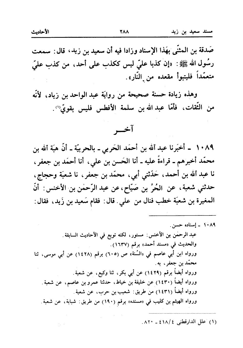 صَدَقَةَ بْنِ الْمُثَنَّى بِهَذَا الإِسْنَادِ وَزَادَا فِيهِ أَنَّ سَعِيدَ بْنَ زَيْدٍ قَالَ سَمِعْتُ رَسُولَ اللَّهِ صَلَّى اللَّهُ عَلَيْهِ وَسَلَّمَ يَقُولُ إِنَّ كَذِبًا عَلَيَّ لَيْسَ كَكَذِبٍ عَلَى أَحَدٍ مَنْ كَذَبَ عَلَيَّ مُتَعَمِّدًا فَلْيَتَبَوَّأْ مَقْعَدَهُ مِنَ النَّارِ وَهَذِه زِيَادَة حَسَنَة صَحِيحَة من رِوَايَة عبد الْوَاحِد بن زِيَاد لِأَنَّهُ من الثِّقَات فَأَما عبد الله بن سَلمَة الْأَفْطَس فَلَيْسَ بِقَوي (إِسْنَاده صَحِيح)