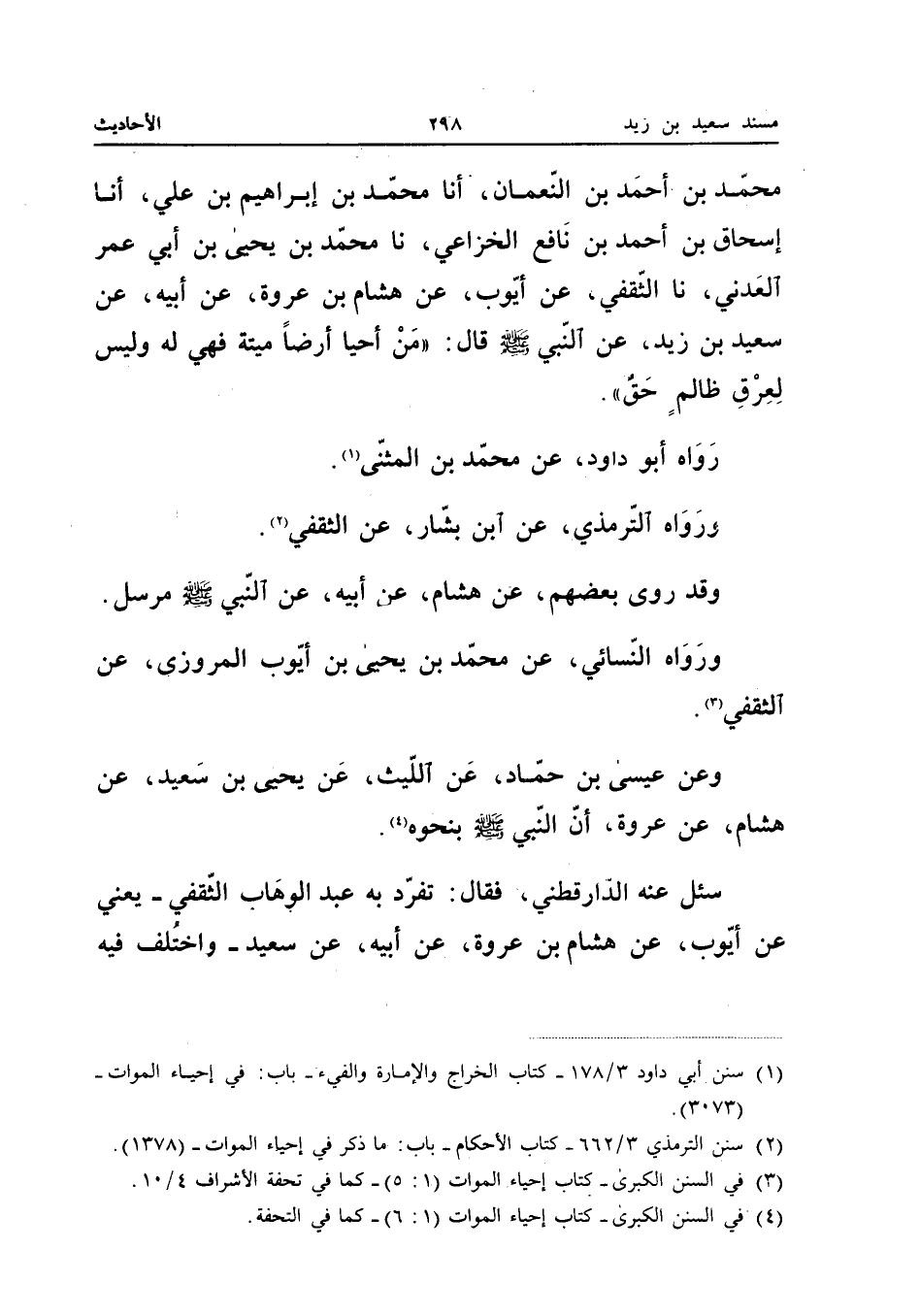 مُحَمَّدِ بْنِ أَحْمَدَ بْنِ النُّعْمَانِ أَنا مُحَمَّدُ بْنُ إِبْرَاهِيمَ بْنِ عَلِيٍّ أَنا إِسْحَاقُ بْنُ أَحْمَدَ بْنِ نَافِعٍ الْخُزَاعِيُّ نَا مُحَمَّدُ بْنُ يَحْيَى بْنِ أَبِي عُمَرَ الْعَدَنِيُّ نَا الثَّقَفِيُّ عَنْ أَيُّوبَ عَنْ هِشَامِ بْنِ عُرْوَةَ عَنْ أَبِيهِ عَنْ سَعِيدِ بْنِ زَيْدٍ عَنِ النَّبِيِّ صَلَّى اللَّهُ عَلَيْهِ وَسَلَّمَ قَالَ مَنْ أَحْيَا أَرْضًا مَيِّتَةً فَهِيَ لَهُ وَلَيْسَ لِعِرْقِ ظَالِمٍ حَقٌّ رَوَاهُ أَبُو دَاوُدَ عَنْ مُحَمَّدِ بْنِ الْمُثَنَّى وَرَوَاهُ التِّرْمِذِيُّ عَنِ ابْنِ بَشَّارٍ عَنِ الثَّقَفِيِّ وَقَدْ رَوَى بَعْضُهُمْ عَنْ هِشَامٍ عَنْ أَبِيهِ عَنِ النَّبِيِّ صَلَّى اللَّهُ عَلَيْهِ وَسَلَّمَ مُرْسَلٌ وَرَوَاهُ النَّسَائِيُّ عَنْ مُحَمَّدِ بْنِ يَحْيَى بْنِ أَيُّوبَ الْمَرْوَزِيِّ عَنِ الثَّقَفِيِّ وَعَنْ عِيسَى بْنِ حَمَّادٍ عَنِ اللَّيْثِ عَنْ يَحْيَى بْنِ سَعِيدٍ عَنْ هِشَامٍ عَنْ عُرْوَةَ أَنَّ النَّبِيَّ صَلَّى اللَّهُ عَلَيْهِ وَسَلَّمَ بِنَحْوِهِ سُئِلَ عَنهُ الدَّارَقُطْنِيّ فَقَالَ تفرد بِهِ عبد الْوَهَّاب الثَّقَفِيُّ يَعْنِي عَنْ أَيُّوبَ عَنْ هِشَامِ بْنِ عُرْوَة عَن أَبِيه عَن سعيد واخلتف فِيهِ