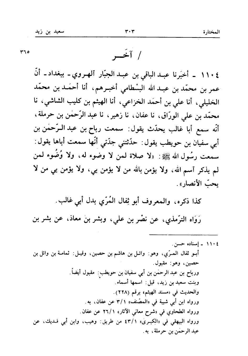 1104 - أخبرنَا عبد الْبَاقِي بن عبد الْجَبَّار الْهَرَوِيُّ بِبَغْدَادَ أَنَّ عُمَرَ بْنَ مُحَمَّدِ بْنِ عبد الله الْبَسْطَامِيَّ أَخْبَرَهُمْ أَنَا أَحْمَدُ بْنُ مُحَمَّدٍ الْخَلِيلِيُّ أَنا عَلِيُّ بْنُ أَحْمَدَ الْخُزَاعِيُّ أَنا الْهَيْثَمُ بْنُ كُلَيْبٍ الشَّاشِيُّ نَا مُحَمَّدُ بْنُ عَلِيٍّ الْوراق نَا عَفَّان نَا زُهَيْر نَا عبد الرَّحْمَن بْنُ حَرْمَلَةَ أَنَّهُ سَمِعَ أَبَا غَالِبٍ يُحَدِّثُ يَقُول سَمِعت رَبَاح بن عبد الرَّحْمَن بْنِ أَبِي سُفْيَانَ بْنِ حُوَيْطِبٍ يَقُولُ حَدَّثَتْنِي جَدَّتِي أَنَّهَا سَمِعَتْ أَبَاهَا يَقُولُ سَمِعْتُ رَسُولَ اللَّهِ صَلَّى اللَّهُ عَلَيْهِ وَسَلَّمَ لَا صَلاةَ لِمَنْ لَا وُضُوءَ لَهُ وَلا وُضُوءَ لِمَنْ لَمْ يَذْكُرِ اسْمَ اللَّهِ وَلا يُؤْمِنُ بِاللَّهِ مَنْ لَا يُؤْمِنُ بِي وَلا يُؤْمِنُ بِي مَنْ لَا يُحِبُّ الأَنْصَارَ كَذَا ذَكَرَهُ وَالْمَعْرُوفُ أَبُو ثِفَالٍ الْمُرِّيُّ بَدَلَ أَبِي غَالِبٍ رَوَاهُ التِّرْمِذِيُّ عَنْ نَصْرِ بْنِ عَلِيٍّ وَبِشْرِ بْنِ معَاذ عَن بشر بن