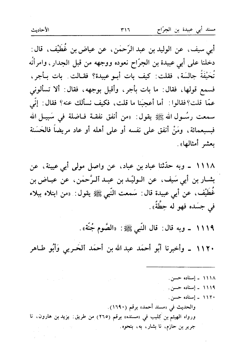 أبي سيف عَن الْوَلِيد بن عبد الرَّحْمَن عَنْ عِيَاضِ بْنِ غُطَيْفٍ قَالَ دَخَلْنَا عَلَى أبي عُبَيْدَة بن الْجَرَّاحِ نَعُودُهُ وَوَجْهُهُ مِنْ قِبَلِ الْجِدَارِ وَامْرَأَتُهُ تحيفة جَالِسَةٌ فَقُلْتُ كَيْفَ بَاتَ أَبُو عُبَيْدَةَ فَقَالَتْ بَاتَ بِأَجْرٍ فَسَمِعَ قَوْلَهَا فَقَالَ مَا بَاتَ بِأَجْرٍ وَأَقْبَلَ بِوَجْهِهِ فَقَالَ أَلا تَسْأَلُونِّي عَمَّا قلت فَقَالُوا أما أَعْجَبَنَا مَا قُلْتَ فَكَيْفَ نَسْأَلُكَ عَنْهُ فَقَالَ إِنِّي سَمِعْتُ رَسُولَ اللَّهِ صَلَّى اللَّهُ عَلَيْهِ وَسَلَّمَ يَقُولُ مَنْ أَنْفَقَ نَفَقَةً فَاضِلَةً فِي سَبِيل الله فبسبعمائة وَمَنْ أَنْفَقَ عَلَى نَفْسِهِ أَوْ عَلَى أَهْلِهِ أَو عَاد مَرِيضا فالحسنة بِعشر أَمْثَالهَا (إِسْنَاده حسن)