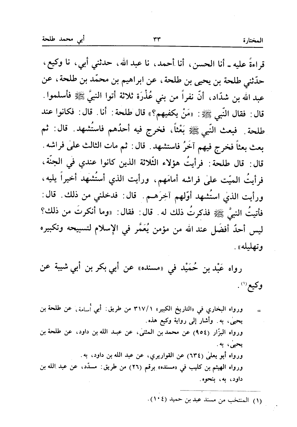 قِرَاءَةً عَلَيْهِ أَنا الْحَسَنُ أَنا أَحْمَدُ نَا عبد الله حَدَّثَنِي أَبِي نَا وَكِيعٌ حَدَّثَنِي طَلْحَةُ بْنُ يَحْيَى بْنِ طَلْحَةَ عَنْ إِبْرَاهِيمَ بْنِ مُحَمَّدِ بن طَلْحَة عَن عبد الله بْنِ شَدَّادٍ أَنَّ نَفَرًا مِنْ بَنِي عَذْرَةَ ثَلاثَةً أَتَوُا النَّبِيَّ صَلَّى اللَّهُ عَلَيْهِ وَسَلَّمَ فَأَسْلَمُوا قَالَ فَقَالَ النَّبِيُّ صَلَّى اللَّهُ عَلَيْهِ وَسَلَّمَ مَنْ يَكْفِيهِمْ قَالَ طَلْحَةُ أَنَا قَالَ فَكَانُوا عِنْدَ طَلْحَةَ فَبَعَثَ النَّبِيُّ صَلَّى اللَّهُ عَلَيْهِ وَسَلَّمَ بَعْثًا فَخَرَجَ فِيهِ أَحَدُهُمْ فَاسْتُشْهِدَ قَالَ ثُمَّ بَعَثَ بَعْثًا فَخَرَجَ فِيهِمْ آخَرُ فَاسْتُشْهِدَ قَالَ ثُمَّ مَاتَ الثَّالِثُ عَلَى فِرَاشِهِ قَالَ قَالَ طَلْحَةُ فَرَأَيْتُ هَؤُلاءِ الثَّلاثَةَ الَّذِينَ كَانُوا عِنْدِي فِي الْجَنَّةِ فَرَأَيْتُ الْمَيِّتَ عَلَى فِرَاشِهِ أَمَامَهُمْ وَرَأَيْتُ الَّذِي اسْتُشْهِدَ أَخِيرًا يَلِيهِ وَرَأَيْتُ الَّذِي اسْتُشْهِدَ أَوَّلُهُمْ آخِرَهُمْ قَالَ فَدَخَلَنِي مِنْ ذَلِكَ قَالَ فَأَتَيْتُ النَّبِيَّ صَلَّى اللَّهُ عَلَيْهِ وَسَلَّمَ فَذَكَرْتُ ذَلِكَ لَهُ قَالَ فَقَالَ وَمَا أَنْكَرْتَ مِنْ ذَلِكَ لَيْسَ أَحَدٌ أَفْضَلَ عِنْدَ اللَّهِ مِنْ مُؤْمِنٍ يُعَمَّرُ فِي الإِسْلامِ لِتَسْبِيحِهِ وَتَكْبِيرِهِ وَتَهْلِيلِهِ رَوَاهُ عَبْدُ بْنُ حُمَيْدٍ فِي مُسْنَدِهِ عَنْ أَبِي بَكْرِ بْنِ أَبِي شَيْبَةَ عَنْ وَكِيعٍ