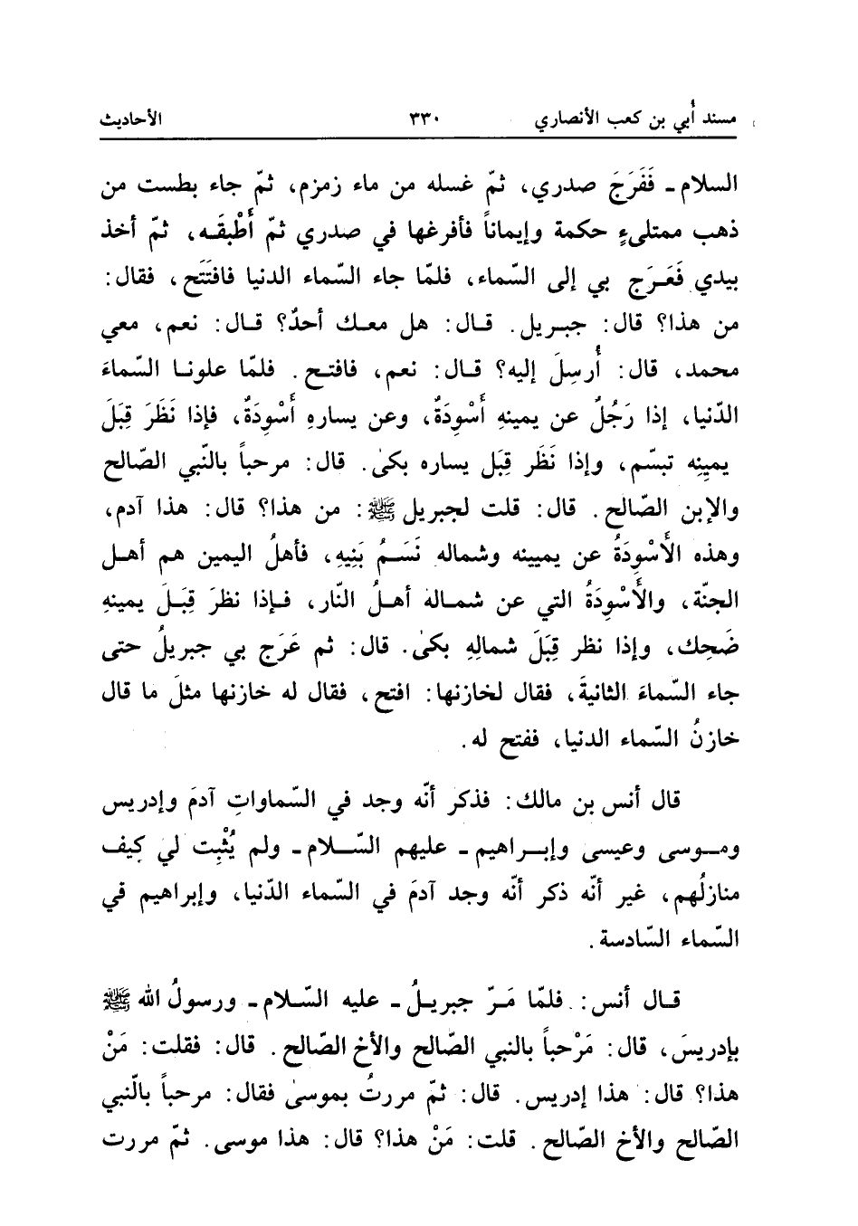 السَّلامُ فَفَرَّجَ صَدْرِي ثُمَّ غَسَلَهُ مِنْ مَاءِ زَمْزَمَ ثُمَّ جَاءَ بِطَسْتٍ مِنْ ذَهَبٍ مُمْتَلِئٍ حِكْمَةً وَإِيمَانًا فَأَفْرَغَهَا فِي صَدْرِي ثُمَّ أَطْبَقَهُ ثُمَّ أَخَذَ بِيَدِي فَعَرَجَ بِي إِلَى السَّمَاءِ فَلَمَّا جَاءَ السَّمَاءُ الدُّنْيَا فَافْتَتَحَ فَقَالَ مَنْ هَذَا قَالَ جِبْرِيلُ قَالَ هَلْ مَعَكَ أَحَدٌ قَالَ نَعَمْ مَعِي مُحَمَّدٌ قَالَ أُرْسِلَ إِلَيْهِ قَالَ نَعَمْ فَافْتَحْ فَلَمَّا عَلَوْنَا السَّمَاءَ الدُّنْيَا إِذَا رَجُلٌ عَنْ يَمِينِهِ أَسْوِدَةٌ وَعَنْ يَسَارِهِ أَسْوِدَةٌ فَإِذَا نَظَرَ قِبَلَ يَمِينِهِ تَبَسَّمَ وَإِذَا نَظَرَ قِبَلَ يَسَارِهِ بَكَى قَالَ مَرْحَبًا بِالنَّبِيِّ الصَّالِحِ وَالابْنِ الصَّالِحِ قَالَ قُلْتُ لِجِبْرِيلَ صَلَّى اللَّهُ عَلَيْهِ وَسَلَّمَ مَنْ هَذَا قَالَ هَذَا آدَمُ وَهَذِهِ الأَسْوِدَةُ عَنْ يَمِينِهِ وَشِمَالِهِ نَسَمُ بَنِيهِ فَأَهْلُ الْيَمِينِ هُمْ أَهْلُ الْجَنَّةِ وَالأَسْوِدَةُ الَّتِي عَنْ شِمَالِهِ أَهْلُ النَّارِ فَإِذَا نَظَرَ قِبَلِ يَمِينِهِ ضَحِكَ وَإِذَا نَظَرَ قِبَلَ شِمَالِهِ بَكَى قَالَ ثُمَّ عَرَجَ بِي جِبْرِيلُ حَتَّى جَاءَ السَّمَاءَ الثَّانِيَةَ فَقَالَ لِخَازِنِهَا افْتَحْ فَقَالَ لَهُ خَازِنُهَا مِثْلَ مَا قَالَ خَازِنُ السَّمَاءِ الدُّنْيَا فَفَتَحَ لَهُ قَالَ أَنَسُ بْنُ مَالِكٍ فَذكر أَنه وجد فِي السَّمَاوَات آدَمَ وَإِدْرِيسَ وَمُوسَى وَعِيسَى وَإِبْرَاهِيمَ عَلَيْهِمُ السَّلامُ وَلَمْ يُثْبِتْ لِي كَيْفَ مَنَازِلُهُمْ غَيْرَ أَنَّهُ ذَكَرَ أَنَّهُ وَجَدَ آدَمَ فِي السَّمَاءِ الدُّنْيَا وَإِبْرَاهِيمَ فِي السَّمَاءِ السَّادِسَةِ قَالَ أَنَسٌ فَلَمَّا مَرَّ جِبْرِيلُ عَلَيْهِ السَّلامُ وَرَسُولُ اللَّهِ صَلَّى اللَّهُ عَلَيْهِ وَسَلَّمَ بِإِدْرِيسَ قَالَ مَرْحَبًا بِالنَّبِيِّ الصَّالِحِ وَالأَخِ الصَّالِحِ قَالَ فَقُلْتُ مَنْ هَذَا قَالَ هَذَا إِدْرِيسُ قَالَ ثُمَّ مَرَرْتُ بِمُوسَى فَقَالَ مَرْحَبًا بِالنَّبِيِّ الصَّالِحِ وَالأَخِ الصَّالِحِ قُلْتُ مَنْ هَذَا قَالَ هَذَا مُوسَى ثُمَّ مَرَرْتُ