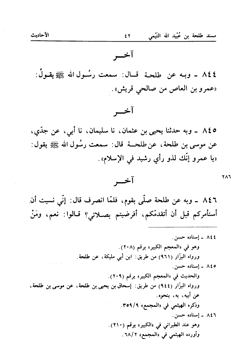 844 - وَبِهِ عَنْ طَلْحَةَ قَالَ سَمِعْتُ رَسُولَ اللَّهِ صَلَّى اللَّهُ عَلَيْهِ وَسَلَّمَ يَقُولُ عَمْرُو بن الْعَاصِ من صالحي قُرَيْش (إِسْنَاده حسن)