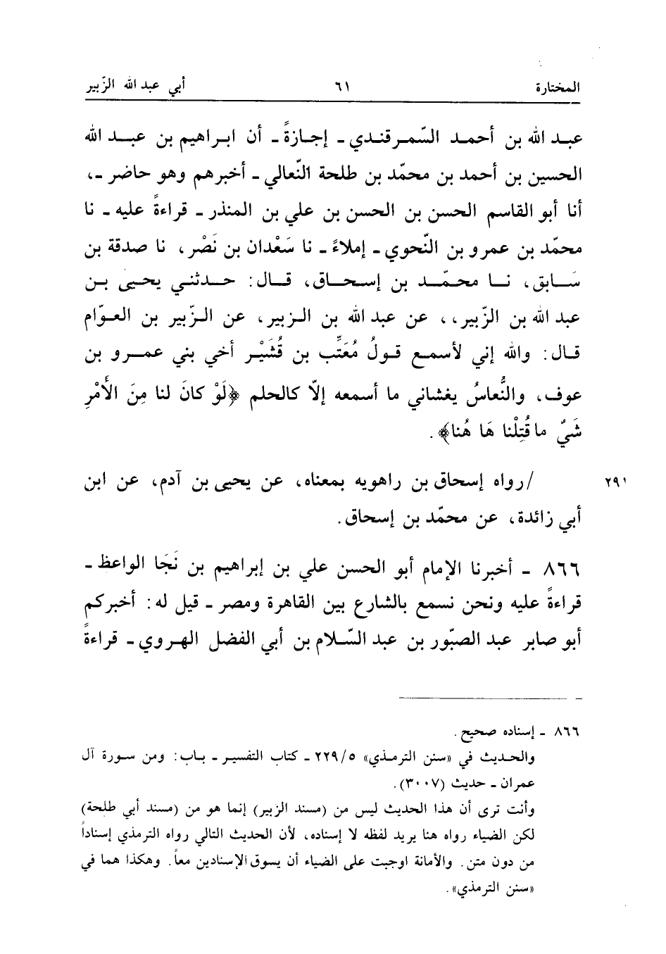عبد الله بْنِ أَحْمَدَ السَّمَرْقَنْدِيُّ إِجَازَةً أَنَّ إِبْرَاهِيمَ بْنَ عبد الله الْحُسَيْن بْن أَحْمَدَ بْنِ مُحَمَّدِ بْنِ طَلْحَةَ النِّعَالِيّ أَخْبَرَهُمْ وَهُوَ حَاضِرٌ أَنا أَبُو الْقَاسِمِ الْحَسَنُ بْنُ الْحَسَنِ بْنِ عَلِيِّ بْنِ الْمُنْذِرِ قِرَاءَةً عَلَيْهِ نَا مُحَمَّدُ بْنُ عَمْرِو بْنِ النَّحْوِيِّ إِمْلاءً نَا سَعْدَانُ بْنُ نَصْرٍ نَا صَدَقَةُ بْنُ سَابِقٍ نَا مُحَمَّدُ بْنُ إِسْحَاقَ قَالَ حَدثنِي يحيى بن عبد الله بن الزبير عَن عبد الله بْنِ الزُّبَيْرِ عَنِ الزُّبَيْرِ بْنِ الْعَوَّامِ قَالَ وَاللَّهِ إِنِّي لأَسْمَعُ قَوْلَ مُعَتِّبِ بْنِ قُشَيْرٍ أَخِي بَنِي عَمْرِو بْنِ عَوْفٍ وَالنُّعَاسُ يَغْشَانِي مَا أَسْمَعُهُ إِلا كَالْحُلْمِ لَوْ كَانَ لَنَا من الْأَمر شَيْء مَا قتلنَا هَا هُنَا رَوَاهُ إِسْحَاقُ بْنُ رَاهُوَيْهِ بِمَعْنَاهُ عَنْ يَحْيَى بْنِ آدَمَ عَنِ ابْنِ أَبِي زَائِدَةَ عَنْ مُحَمَّد بن إِسْحَاق (إِسْنَاده حسن)