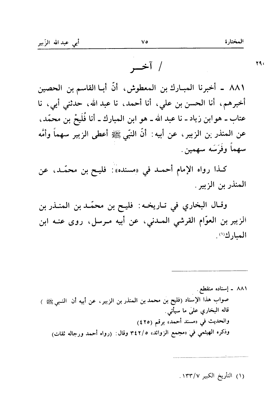 881 - أخبرنَا الْمُبَارك بن الْمَعْطُوشِ أَنَّ أَبَا الْقَاسِمِ بْنَ الْحُصَيْنِ أَخْبَرَهُمْ أَنا الْحَسَنُ بْنُ عَلِيٍّ أَنا أَحْمَدُ نَا عبد الله حَدَّثَنِي أَبِي نَا عَتَّابٌ هُوَ ابْنُ زِيَادٍ نَا عبد الله هُوَ ابْنُ الْمُبَارَكِ أَنا فُلَيْحُ بْنُ مُحَمَّدٍ عَنِ الْمُنْذِرِ بْنِ الزُّبَيْرِ عَنْ أَبِيهِ أَنَّ النَّبِيَّ صَلَّى اللَّهُ عَلَيْهِ وَسَلَّمَ أَعْطَى الزُّبَيْرَ سَهْمًا وَأُمَّهُ سَهْمًا وَفَرَسَهُ سَهْمَيْنِ كَذَا رَوَاهُ الإِمَامُ أَحْمَدُ فِي مُسْنَدِهِ فُلَيْحُ بْنُ مُحَمَّدٍ عَنِ الْمُنْذِرِ بْنِ الزُّبَيْرِ وَقَالَ الْبُخَارِيُّ فِي تَارِيخِهِ فُلَيْحُ بْنُ مُحَمَّدِ بْنِ الْمُنْذِرِ بْنِ الزُّبَيْرِ بْنِ الْعَوَّامِ الْقُرَشِيُّ الْمَدَنِيُّ عَنْ أَبِيهِ مُرْسل روى عَنهُ ابْن الْمُبَارك (إِسْنَاده مُنْقَطع)