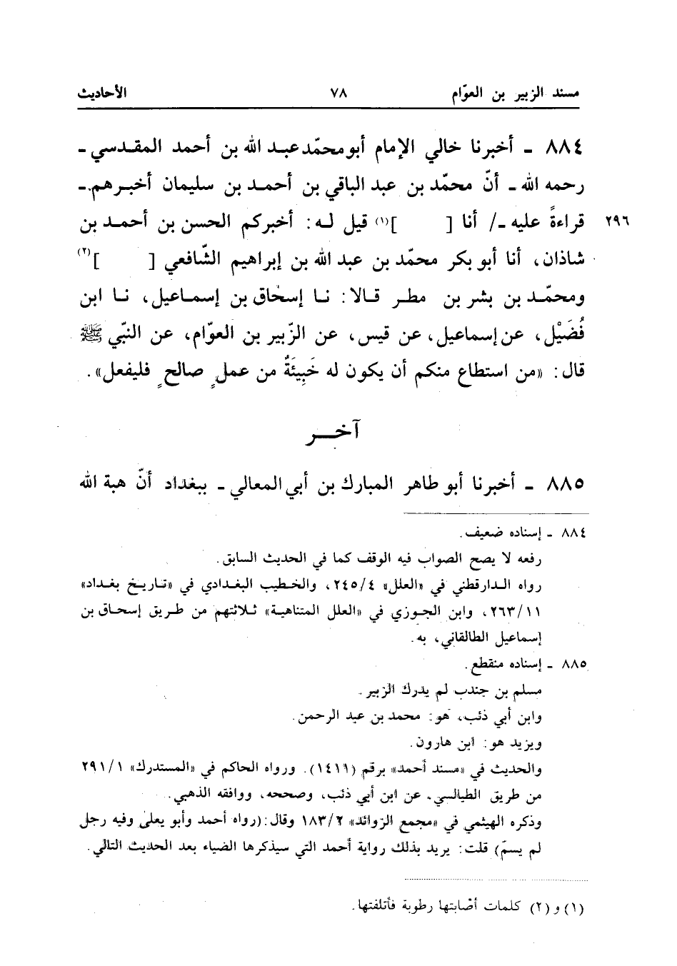 884 - أخبرنَا خَالِي الإِمَام أَبُو مُحَمَّد عبد الله بْنُ أَحْمَدَ الْمَقْدِسِيُّ رَحِمَهُ اللَّهُ أَنَّ مُحَمَّدَ بن عبد الْبَاقِي بْنِ أَحْمَدَ بْنِ سُلَيْمَانَ أَخْبَرَهُمْ قِرَاءَةً عَلَيْهِ أَنا قِيلَ لَهُ أَخْبَرَكُمُ الْحَسَنُ بْنُ أَحْمَدَ بْنِ شَاذَانَ أَنا أَبُو بَكْرٍ مُحَمَّدُ بْنُ عبد الله بْنِ إِبْرَاهِيمَ الشَّافِعِيُّ وَمُحَمَّدُ بْنُ بِشْرِ بْنِ مَطَرٍ قَالا نَا إِسْحَاقُ بْنُ إِسْمَاعِيلَ نَا ابْنِ فُضَيْلٍ عَنْ إِسْمَاعِيلَ عَنْ قَيْسٍ عَنِ الزُّبَيْرِ بْنِ الْعَوَّامِ عَنِ النَّبِيِّ صَلَّى اللَّهُ عَلَيْهِ وَسَلَّمَ قَالَ مَنِ اسْتَطَاعَ مِنْكُمْ أَنْ يَكُونَ لَهُ خَبِيئَةٌ مِنْ عَمَلٍ صَالِحٍ فَلْيَفْعَلْ (إِسْنَاده ضَعِيف)