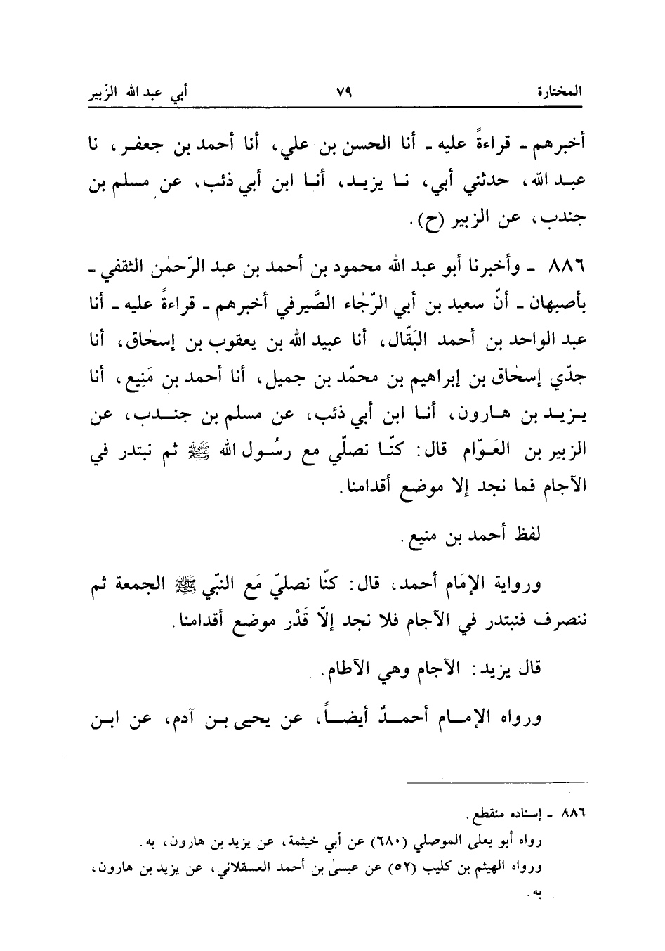 886 - وَأخْبرنَا أَبُو عبد الله مَحْمُود بن أَحْمد بن عبد الرَّحْمَن الثَّقَفِيُّ بِأَصْبَهَانَ أَنَّ سَعِيدَ بْنَ أَبِي الرَّجَاءِ الصَّيْرَفِي أخْبرهُم قِرَاءَة عَلَيْهِ أَنا عبد الْوَاحِد بْنُ أَحْمَدَ الْبَقَّالُ أَنا عُبَيْدُ اللَّهِ بْنُ يَعْقُوبَ بْنِ إِسْحَاقَ أَنا جَدِّي إِسْحَاقُ بْنُ إِبْرَاهِيمَ بْنِ مُحَمَّدِ بْنِ جَمِيلٍ أَنا أَحْمَدُ بْنُ مَنِيعٍ أَنا يَزِيدُ بْنُ هَارُونَ أَنا ابْنِ أَبِي ذِئْبٍ عَنْ مُسْلِمِ بْنِ جُنْدُبٍ عَنِ الزُّبَيْرِ بْنِ الْعَوَّامِ قَالَ كُنَّا نُصَلِّي مَعَ رَسُولِ اللَّهِ صَلَّى اللَّهُ عَلَيْهِ وَسَلَّمَ ثُمَّ نَبْتَدِرُ فِي الآجَامِ فَمَا نَجِدُ إِلا مَوْضِعَ أَقْدَامِنَا لَفْظُ أَحْمَدَ بْنِ مَنِيعٍ وَرِوَايَةُ الإِمَامِ أَحْمَدَ قَالَ كُنَّا نُصَلِّي مَعَ النَّبِيِّ صَلَّى اللَّهُ عَلَيْهِ وَسَلَّمَ الْجُمُعَةَ ثُمَّ نَنْصَرِفُ فَنَبْتَدِرُ فِي الآجَامِ فَلا نَجِدُ إِلا قَدْرَ مَوْضِعِ أَقْدَامِنَا قَالَ يَزِيدُ الآجَامُ وَهِيَ الآطَامُ وَرَوَاهُ الإِمَامُ أَحْمَدُ أَيْضًا عَنْ يَحْيَى بْنِ آدَمَ عَنِ ابْنِ