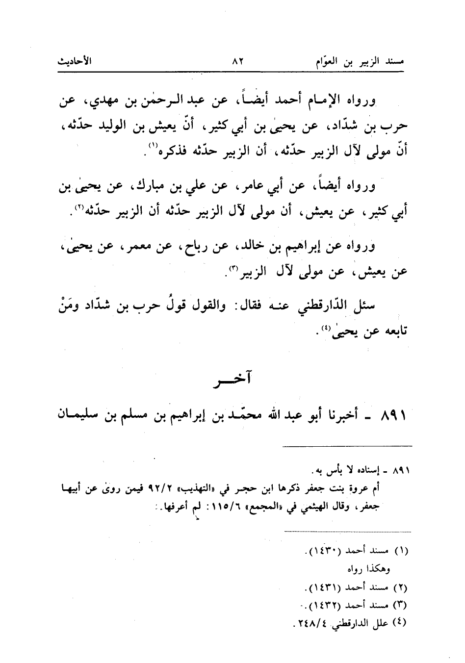 وَرَوَاهُ الإِمَام أَحْمد أَيْضا عَن عبد الرَّحْمَن بْنِ مَهْدِيٍّ عَنْ حَرْبِ بْنِ شَدَّادٍ عَنْ يَحْيَى بْنِ أَبِي كَثِيرٍ أَنَّ يَعِيشَ بْنَ الْوَلِيدِ حَدَّثَهُ أَنَّ مَوْلًى لآلِ الزُّبَيْرِ حَدَّثَهُ أَنَّ الزُّبَيْرَ حَدَّثَهُ فَذَكَرَهُ وَرَوَاهُ أَيْضًا عَنْ أَبِي عَامِرٍ عَنْ عَلِيِّ بْنِ مُبَارَكٍ عَنْ يَحْيَى بْنِ أَبِي كَثِيرٍ عَنْ يَعِيشَ أَنَّ مَوْلًى لآلِ الزُّبَيْرِ حَدَّثَهُ أَنَّ الزُّبَيْرَ حَدَّثَهُ وَرَوَاهُ عَنْ إِبْرَاهِيمَ بْنِ خَالِدٍ عَنْ رَبَاحٍ عَنْ مَعْمَرٍ عَنْ يَحْيَى عَنْ يَعِيشَ عَنْ مَوْلًى لآلِ الزُّبَيْرِ سُئِلَ الدَّارَقُطْنِيُّ عَنْهُ فَقَالَ وَالْقَوْلُ قَوْلُ حَرْبِ بْنِ شَدَّادٍ وَمَنْ تَابَعَهُ عَن يحيى (إِسْنَاده مُنْقَطع)