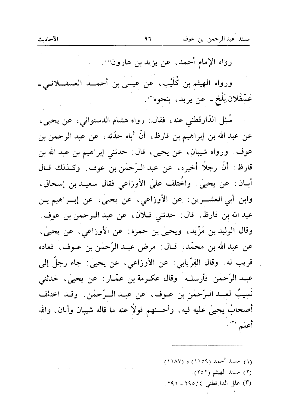 رَوَاهُ الإِمَامُ أَحْمَدُ عَنْ يَزِيدَ بْنِ هَارُونَ وَرَوَاهُ الْهَيْثَمُ بْنُ كُلَيْبٍ عَنْ عِيسَى بْنِ أَحْمَدَ الْعَسْقَلانِيِّ عَسْقَلانِ بَلْخٍ عَنْ يَزِيدَ بِنَحْوِهِ سُئِلَ الدَّارَقُطْنِيُّ عَنْهُ فَقَالَ رَوَاهُ هِشَامٌ الدَّسْتُوَائِيُّ عَن يحيى عَن عبد الله بْنِ إِبْرَاهِيمَ بْنِ قَارِظٍ أَنَّ أَبَاهُ حَدَّثَهُ عَن عبد الرَّحْمَن بْنِ عَوْفٍ وَرَوَاهُ شَيْبَانُ عَنْ يَحْيَى قَالَ حَدثنِي إِبْرَاهِيم بن عبد الله بن قارظ أَن رجلا أخبرهُ عَن عبد الرَّحْمَن بْنِ عَوْفٍ وَكَذَلِكَ قَالَ أَبَانٌ عَنْ يَحْيَى وَاخْتُلِفَ عَلَى الأَوْزَاعِيِّ فَقَالَ سَعِيدُ بْنُ إِسْحَاقَ وَابْنِ أَبِي الْعِشْرِينَ عَنِ الأَوْزَاعِيِّ عَنْ يَحْيَى عَن إِبْرَاهِيم بن عبد الله بن قارظ قَالَ حَدثنِي فلَان عَن عبد الرَّحْمَن بْنِ عَوْفٍ وَقَالَ الْوَلِيدُ بْنُ مَزْيَدٍ وَيَحْيَى بْنُ حَمْزَةَ عَنِ الأَوْزَاعِيِّ عَنْ يَحْيَى عَنْ عبد الله بن مُحَمَّد قَالَ مرض عبد الرَّحْمَن بْنُ عَوْفٍ فَعَادَهُ قَرِيبٌ لَهُ وَقَالَ الْفِرْيَابِيُّ عَنِ الأَوْزَاعِيِّ عَنْ يَحْيَى جَاءَ رَجُلٌ إِلَى عبد الرَّحْمَن فَأَرْسَلَهُ وَقَالَ عِكْرِمَةُ بْنُ عَمَّارٍ عَنْ يَحْيَى حَدثنِي نسيب لعبد الرَّحْمَن بن عَوْف عَن عبد الرَّحْمَن وَقَدِ اخْتَلَفَ أَصْحَابُ يَحْيَى عَلَيْهِ فِيهِ وَأَحْسَنُهُمْ قَوْلا عَنْهُ مَا قَالَهُ شَيْبَانُ وَأَبَانٌ وَاللَّهُ أعلم