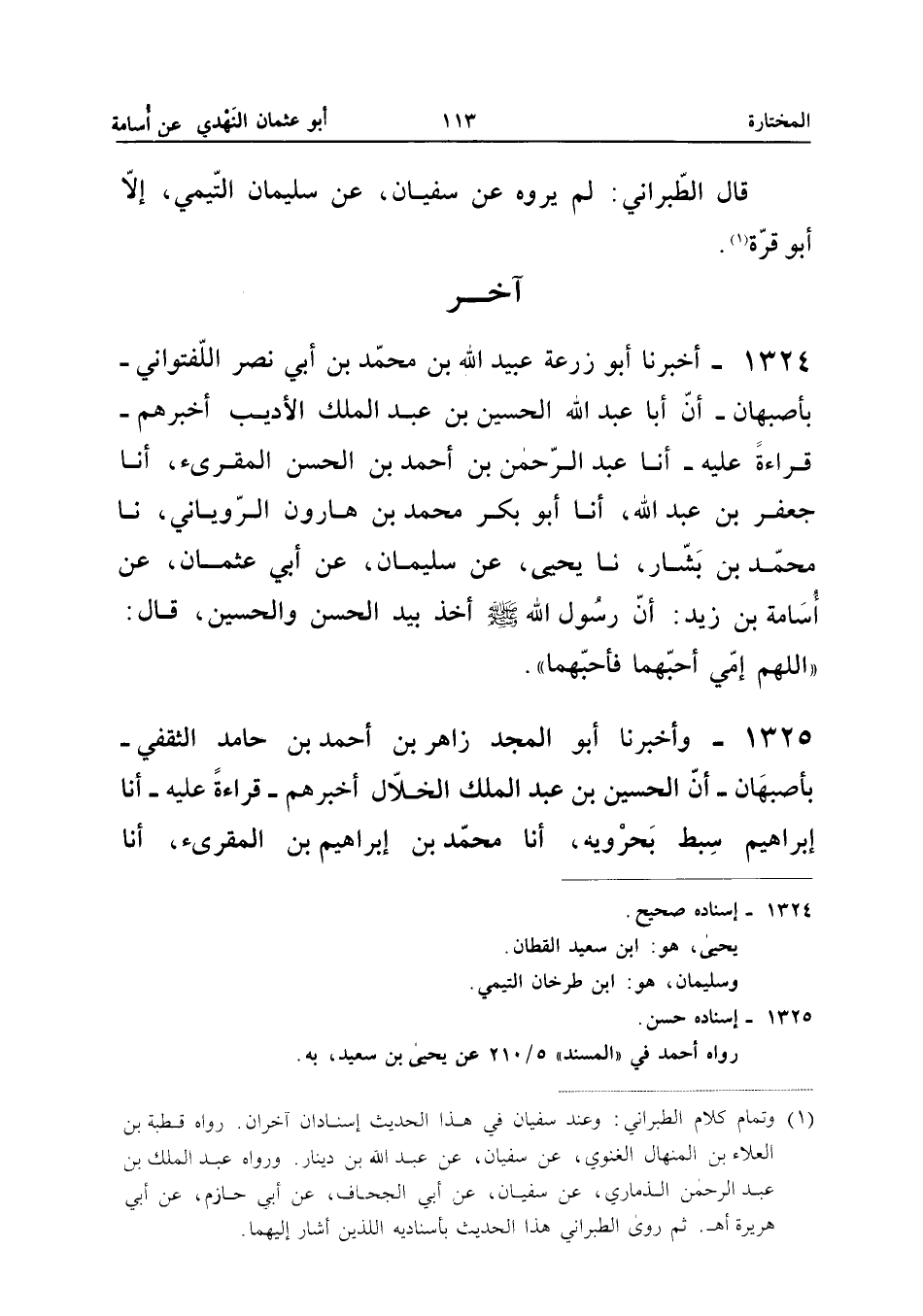 1324 - أَخْبَرَنَا أَبُو زُرْعَةَ عُبَيْدُ اللَّهِ بْنُ مُحَمَّدِ بْنِ أَبِي نَصْرٍ اللَّفْتُوَانِيُّ بِأَصْبَهَانَ أَنَّ أَبَا عَبْدِ اللَّهِ الْحُسَيْنَ بْنَ عَبْدِ الْمَلِكِ الأَدِيبَ أَخْبَرَهُمْ قِرَاءَةً عَلَيْهِ أَنا عَبْدُ الرَّحْمَنِ بْنُ أَحْمَدَ بْنِ الْحَسَنِ الْمُقْرِئُ أَنا جَعْفَرُ بْنُ عَبْدِ اللَّهِ أَنا أَبُو بَكْرٍ مُحَمَّدُ بْنُ هَارُونَ الرُّويَانِيُّ نَا مُحَمَّدُ بْنُ بَشَّارٍ نَا يَحْيَى عَنْ سُلَيْمَانَ عَنْ أَبِي عُثْمَانَ عَنْ أُسَامَةَ بْنِ زَيْدٍ أَنَّ رَسُولَ اللَّهِ صَلَّى اللَّه عَلَيْهِ وَسَلَّمَ أَخَذَ بِيَدِ الْحَسَنِ وَالْحُسَيْن قَالَ اللَّهُمَّ إمي أحبهما فأحبهما إِسْنَاده صَحِيح