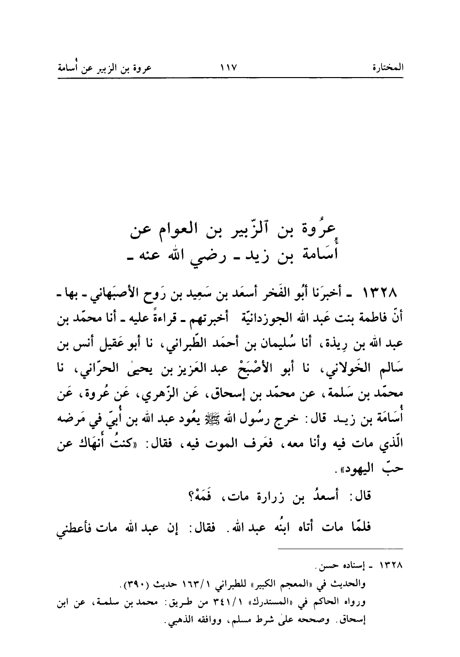 1328 - أَخْبَرَنَا أَبُو الْفَخْرِ أَسْعَدُ بْنُ سَعِيدِ بْنِ رَوْحٍ الأَصْبَهَانِيُّ بِهَا أَنَّ فَاطِمَةَ بِنْتَ عَبْدِ اللَّهِ الْجَوْزِدَانِيَّةَ أَخْبَرَتْهُمْ قِرَاءَةً عَلَيْهِ أَنَا مُحَمَّدُ بْنُ عَبْدِ اللَّهِ بْنِ رِيذَةَ أَنا سُلَيْمَانُ بْنُ أَحْمَدَ الطَّبَرَانِيُّ نَا أَبُو عُقَيْلٍ أَنَسُ بْنُ سَالِمٍ الْخَوْلانِيُّ نَا أَبُو الأَصْبَحِ عَبْدُ الْعَزِيزِ بْنُ يَحْيَى الْحَرَّانِيُّ نَا مُحَمَّدُ بْنُ سَلَمَةَ عَنْ مُحَمَّدِ بْنِ إِسْحَاقَ عَنِ الزُّهْرِيِّ عَنْ عُرْوَةَ عَنْ أُسَامَةَ بْنِ زَيْدٍ قَالَ خَرَجَ رَسُولُ اللَّهِ صَلَّى اللَّهُ عَلَيْهِ وَسَلَّمَ يَعُودُ عَبْدَ اللَّهِ بْنَ أُبَيٍّ فِي مَرَضِهِ الَّذِي مَاتَ فِيهِ وَأَنَا مَعَهُ فَعَرَفَ الْمَوْتَ فِيهِ فَقَالَ كُنْتُ أَنْهَاكَ عَنْ حُبِّ الْيَهُودِ قَالَ أَسْعَدُ بْنُ زُرَارَةَ مَاتَ فَمَهْ فَلَمَّا مَاتَ أَتَاهُ ابْنُهُ عَبْدُ اللَّهِ فَقَالَ إِنَّ عَبْدَ اللَّهِ مَاتَ فَأَعْطِنِي