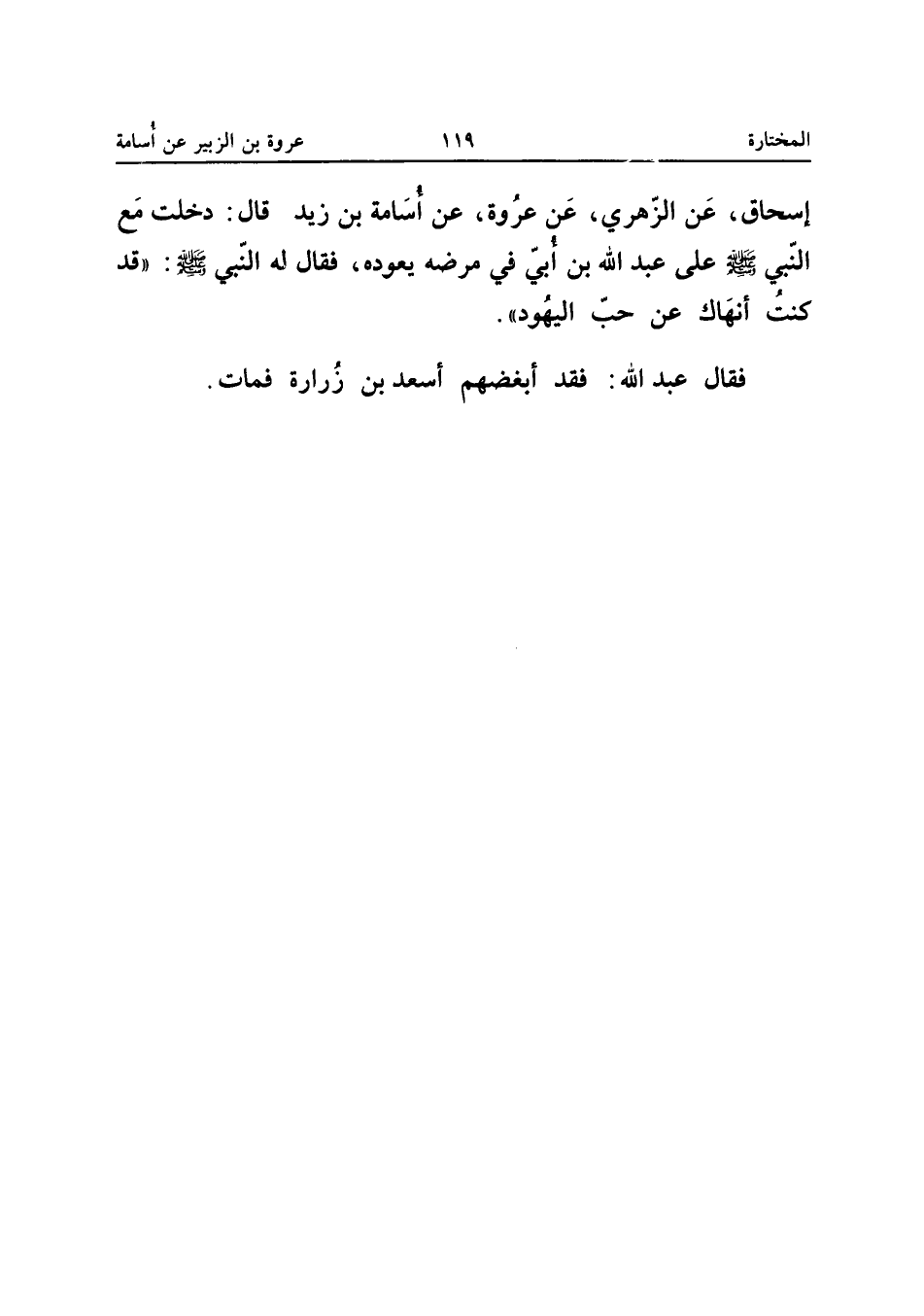 صَلَّى اللَّهُ عَلَيْهِ وَسَلَّمَ عَلَى عَبْدِ اللَّهِ بْنِ أُبَيٍّ فِي مَرَضِهِ يَعُودُهُ فَقَالَ لَهُ النَّبِيُّ صَلَّى اللَّهُ عَلَيْهِ وَسَلَّمَ قَدْ كُنْتُ أَنْهَاكَ عَنْ حُبِّ الْيَهُودِ فَقَالَ عَبْدُ اللَّهِ فقد أبْغضهُم أسعد بن زُرَارَة فَمَاتَ إِسْنَاده حسن