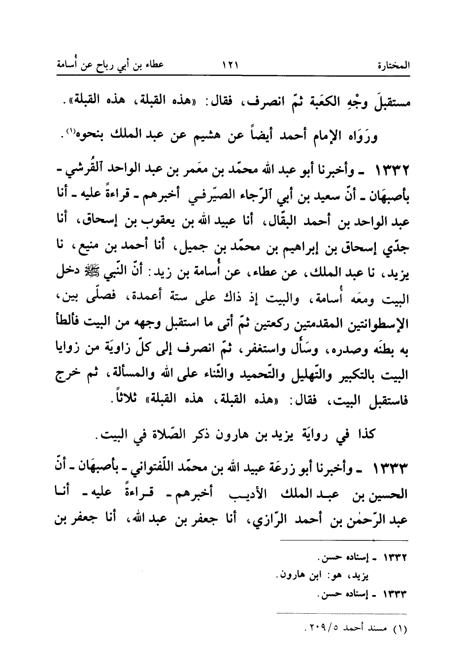 1332 - وأَخْبَرَنَا أَبُو عَبْدِ اللَّهِ مُحَمَّدُ بْنُ مَعْمَرٍ بْنِ عَبْدِ الْوَاحِدِ الْقُرَشِيُّ بِأَصْبَهَانَ أَنَّ سَعِيدَ بْنَ أَبِي الرَّجَاءِ الصَّيْرَفِيَّ أَخْبَرَهُمْ قِرَاءَةً عَلَيْهِ أَنا عَبْدُ الْوَاحِدِ بْنُ أَحْمَدَ الْبَقَّالُ أَنا عُبَيْدُ اللَّهِ بْنُ يَعْقُوبَ بْنِ إِسْحَاقَ أَنا جَدِّي إِسْحَاقُ بْنُ إِبْرَاهِيمَ بْنِ مُحَمَّدِ بْنِ جَمِيلٍ أَنا أَحْمَدُ بْنُ مَنِيعٍ نَا يَزِيدُ نَا عَبْدُ الْمَلِكِ عَنْ عَطَاءٍ عَنْ أُسَامَةَ بْنِ زَيْدٍ أَنَّ النَّبِيَّ صَلَّى اللَّهُ عَلَيْهِ وَسَلَّمَ دَخَلَ الْبَيْتَ وَمَعَهُ أُسَامَةُ وَالْبَيْتُ إِذْ ذَاكَ عَلَى سِتَّةِ أَعْمِدَةٍ فَصَلَّى بَيْنَ الإِسْطُوَانَتَيْنِ الْمُقَدَّمَتَيْنِ رَكْعَتَيْنِ ثُمَّ أَتَى مَا اسْتَقْبَلَ وَجْهُهُ مِنَ الْبَيْتِ فَأَلْطَأَ بِهِ بَطْنَهُ وَصَدْرَهُ وَسَأَلَ وَاسْتَغْفَرَ ثُمَّ انْصَرَفَ إِلَى كُلِّ زَاوِيَةٍ مِنْ زَوَايَا الْبَيْتِ بِالتَّكْبِيرِ وَالتَّهْلِيلِ وَالتَّحْمِيدِ وَالثَّنَاءِ عَلَى اللَّهِ وَالْمَسْأَلَةِ ثُمَّ خَرَجَ فَاسْتَقْبَلَ الْبَيْتَ فَقَالَ هَذِهِ الْقِبْلَةُ هَذِهِ الْقِبْلَةُ ثَلاثًا كَذَا فِي رِوَايَةِ يَزِيدَ بْنِ هَارُونَ ذِكْرُ الصَّلاةِ فِي الْبَيْت إِسْنَاده حسن