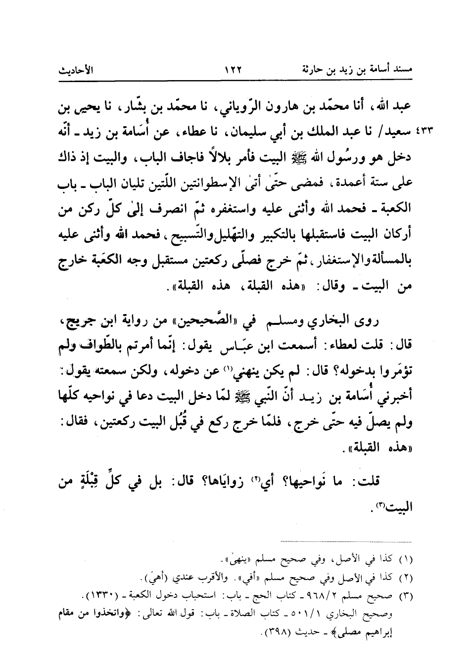 صَلَّى اللَّهُ عَلَيْهِ وَسَلَّمَ الْبَيْتَ فَأَمَرَ بِلالا فَأَجَافَ الْبَابَ وَالْبَيْتُ إِذْ ذَاكَ عَلَى سِتَّةِ أَعْمِدَةٍ فَمَضَى حَتَّى أَتَى الإِسْطُوَانَتَيْنِ اللَّتَيْنِ تَلِيَانِ الْبَابَ بَابَ الْكَعْبَةِ فَحَمِدَ اللَّهَ وَأَثْنَى عَلَيْهِ وَاسْتَغْفَرَهُ ثُمَّ انْصَرَفَ إِلَى كُلِّ رُكْنٍ مِنْ أَرْكَانِ الْبَيْتِ فَاسْتَقْبَلَهَا بِالتَّكْبِيرِ وَالتَّهْلِيلِ وَالتَّسْبِيحِ فَحَمِدَ اللَّهَ وَأَثْنَى عَلَيْهِ بِالْمَسْأَلَةِ وَالاسْتِغْفَارِ ثُمَّ خَرَجَ فصلى رَكْعَتَيْنِ مُسْتَقْبل وَجه الْكَعْبَة خَارج مِنَ الْبَيْتِ وَقَالَ هَذِهِ الْقِبْلَةُ هَذِهِ الْقِبْلَةُ رَوَى الْبُخَارِيُّ وَمُسْلِمٌ فِي الصَّحِيحَيْنِ مِنْ رِوَايَةِ ابْنِ جُرَيْجٍ قَالَ قُلْتُ لِعَطَاءٍ أَسَمِعْتَ ابْنَ عَبَّاسٍ يَقُولُ إِنَّمَا أُمُرْتُمْ بِالطَّوَافِ وَلَمْ تُؤْمَرُوا بِدُخُولِهِ قَالَ لَمْ يَكُنْ يَنْهَنِي عَنْ دُخُولِهِ وَلَكِنْ سَمِعْتُهُ يَقُولُ أخبرنِي أُسَامَةُ بْنُ زَيْدٍ أَنَّ النَّبِيَّ صَلَّى اللَّه عَلَيْهِ وَسَلَّمَ لَمَّا دَخَلَ الْبَيْتَ دَعَا فِي نَوَاحِيهِ كُلِّهَا وَلَمْ يُصَلِّ فِيهِ حَتَّى خَرَجَ فَلَمَّا خَرَجَ رَكَعَ فِي قِبَلِ الْبَيْتِ رَكْعَتَيْنِ فَقَالَ هَذِهِ الْقِبْلَةُ قُلْتُ مَا نَوَاحِيهَا أَيْ زَوَايَاهَا قَالَ بَلْ فِي كُلِّ قِبْلَةٍ مِنَ الْبَيْتِ