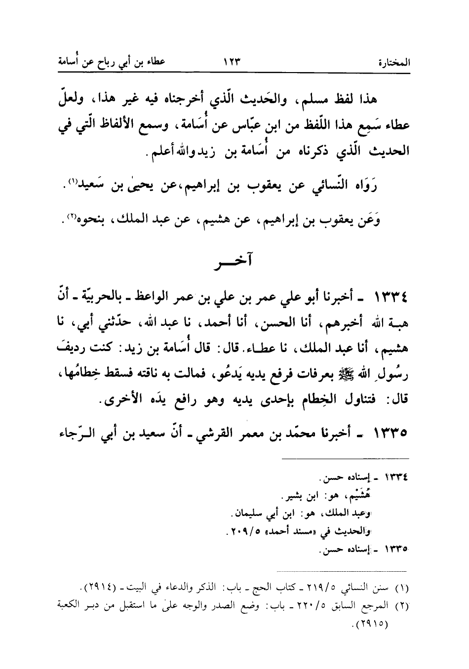 1334 - أَخْبَرَنَا أَبُو عَلِيٍّ عُمَرُ بْنُ عَلِيٍّ بْنِ عُمَرَ الْوَاعِظُ بِالْحَرْبِيَّةِ أَنَّ هِبَةَ اللَّهِ أَخْبَرَهُمْ أَنا الْحَسَنُ أَنا أَحْمَدُ نَا عَبْدُ اللَّهِ حَدَّثَنِي أَبِي نَا هُشَيْمٌ أَنا عَبْدُ الْمَلِكِ نَا عَطَاءٌ قَالَ قَالَ أُسَامَةُ بْنُ زَيْدٍ كُنْتُ رَدِيفَ رَسُولِ اللَّهِ صَلَّى اللَّهُ عَلَيْهِ وَسَلَّمَ بِعَرَفَاتٍ فَرَفَعَ يَدَيْهِ يَدْعُو فَمَالَتْ بِهِ نَاقَتُهُ فَسَقَطَ خِطَامُهَا قَالَ فَتَنَاوَلَ الْخِطَامَ بِإِحْدَى يَدَيْهِ وَهُوَ رَافع يَده الْأُخْرَى إِسْنَاده حسن