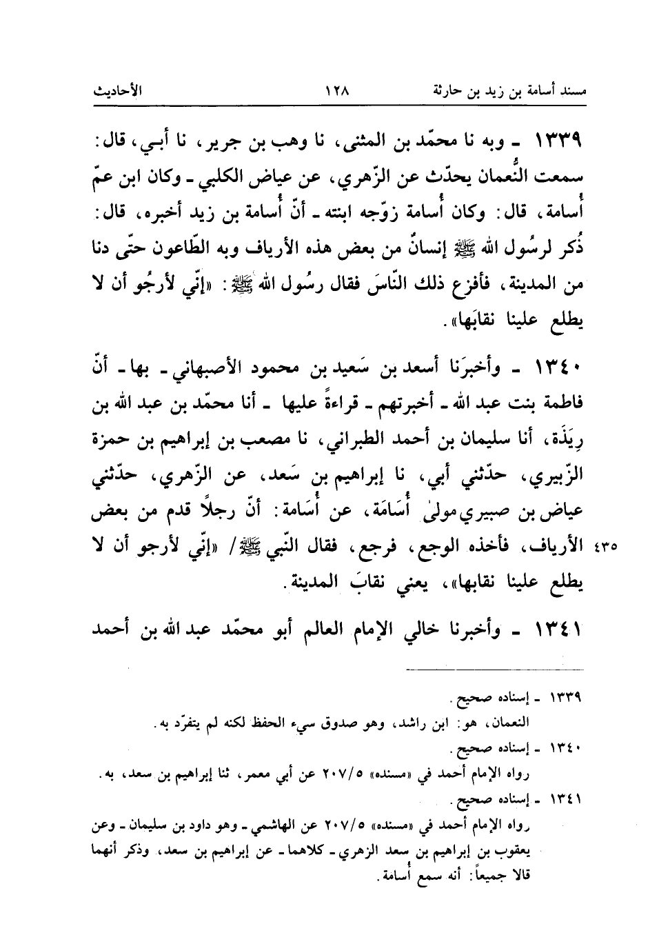 1340 - وَأخْبرنَا أسعد بن بْنُ سَعِيدِ بْنِ مَحْمُودٍ الأَصْبَهَانِيُّ بِهَا أَنَّ فَاطِمَةَ بِنْتَ عَبْدِ اللَّهِ أَخْبَرَتْهُمْ قِرَاءَةً عَلَيْهَا أَنَا مُحَمَّدُ بْنُ عَبْدِ اللَّهِ بْنِ رِيذَةَ أَنا سُلَيْمَانُ بْنُ أَحْمَدَ الطَّبَرَانِيُّ نَا مُصْعَبُ بْنُ إِبْرَاهِيمَ بْنِ حَمْزَةَ الزُّبَيْرِيُّ حَدَّثَنِي أَبِي نَا إِبْرَاهِيمُ بْنُ سَعْدٍ عَنِ الزُّهْرِيِّ حَدَّثَنِي عِيَاضُ بْنُ صُبَيْرِيٍّ مَوْلَى أُسَامَةَ عَنْ أُسَامَةَ أَنَّ رَجُلا قَدِمَ مِنْ بَعْضِ الأَرْيَافِ فَأَخَذَهُ الْوَجَعُ فَرَجَعَ فَقَالَ النَّبِيُّ صَلَّى اللَّهُ عَلَيْهِ وَسَلَّمَ إِنِّي لأَرْجُو أَنْ لَا يَطْلُعَ عَلَيْنَا نقابها يَعْنِي نقاب الْمَدِينَة إِسْنَاده صَحِيح
