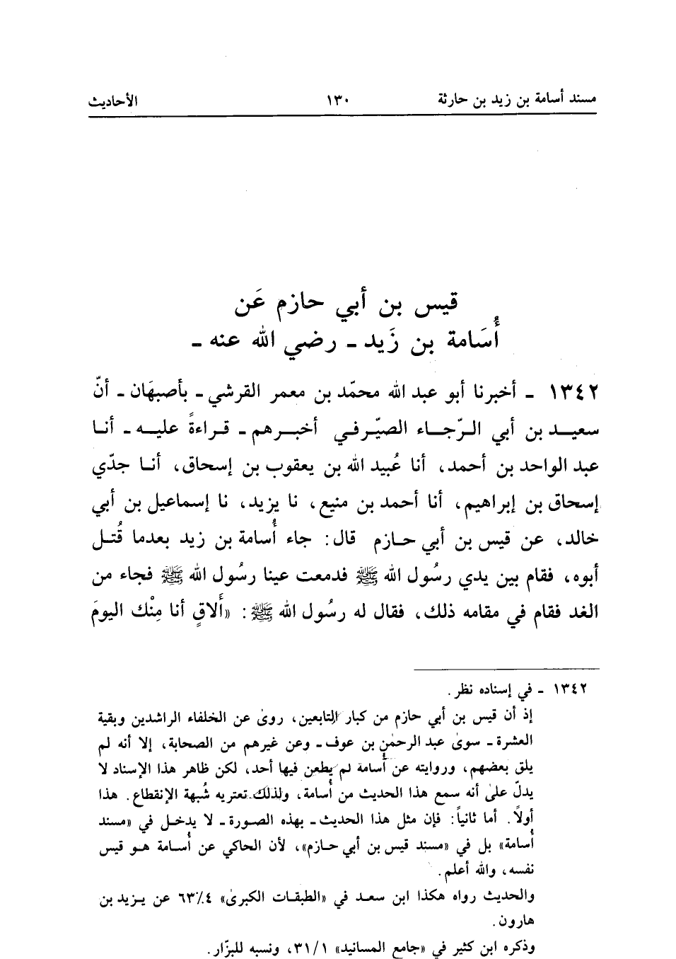 1342 - أَخْبَرَنَا أَبُو عَبْدِ اللَّهِ مُحَمَّدُ بْنُ مَعْمَرِ الْقُرَشِيُّ بِأَصْبَهَانَ أَنَّ سَعِيدَ بْنَ أَبِي الرَّجَاءِ الصَّيْرَفِيَّ أَخْبَرَهُمْ قِرَاءَةً عَلَيْهِ أَنا عَبْدُ الْوَاحِدِ بْنُ أَحْمَدَ أَنا عُبَيْدُ اللَّهِ بْنُ يَعْقُوبَ بْنِ إِسْحَاقَ أَنا جَدِّي إِسْحَاقُ بْنُ إِبْرَاهِيمَ أَنا أَحْمَدُ بْنُ مَنِيعٍ نَا يَزِيدُ نَا إِسْمَاعِيلُ بْنُ أَبِي خَالِدٍ عَنْ قَيْسِ بْنِ أَبِي حَازِمٍ قَالَ جَاءَ أُسَامَةُ بْنُ زَيْدٍ بَعْدَمَا قُتِلَ أَبُوهُ فَقَامَ بَيْنَ يَدَيْ رَسُولِ اللَّهِ صَلَّى اللَّهُ عَلَيْهِ وَسَلَّمَ فَدَمِعَتْ عَيْنَا رَسُولُ اللَّهِ صَلَّى اللَّه عَلَيْهِ وَسَلَّمَ فَجَاءَ مِنَ الْغَدِ فَقَامَ فِي مَقَامِهِ ذَلِكَ فَقَالَ لَهُ رَسُولُ اللَّهِ صَلَّى اللَّهُ عَلَيْهِ وَسَلَّمَ أَلاقٍ أَنَا مِنْكَ الْيَوْمَ