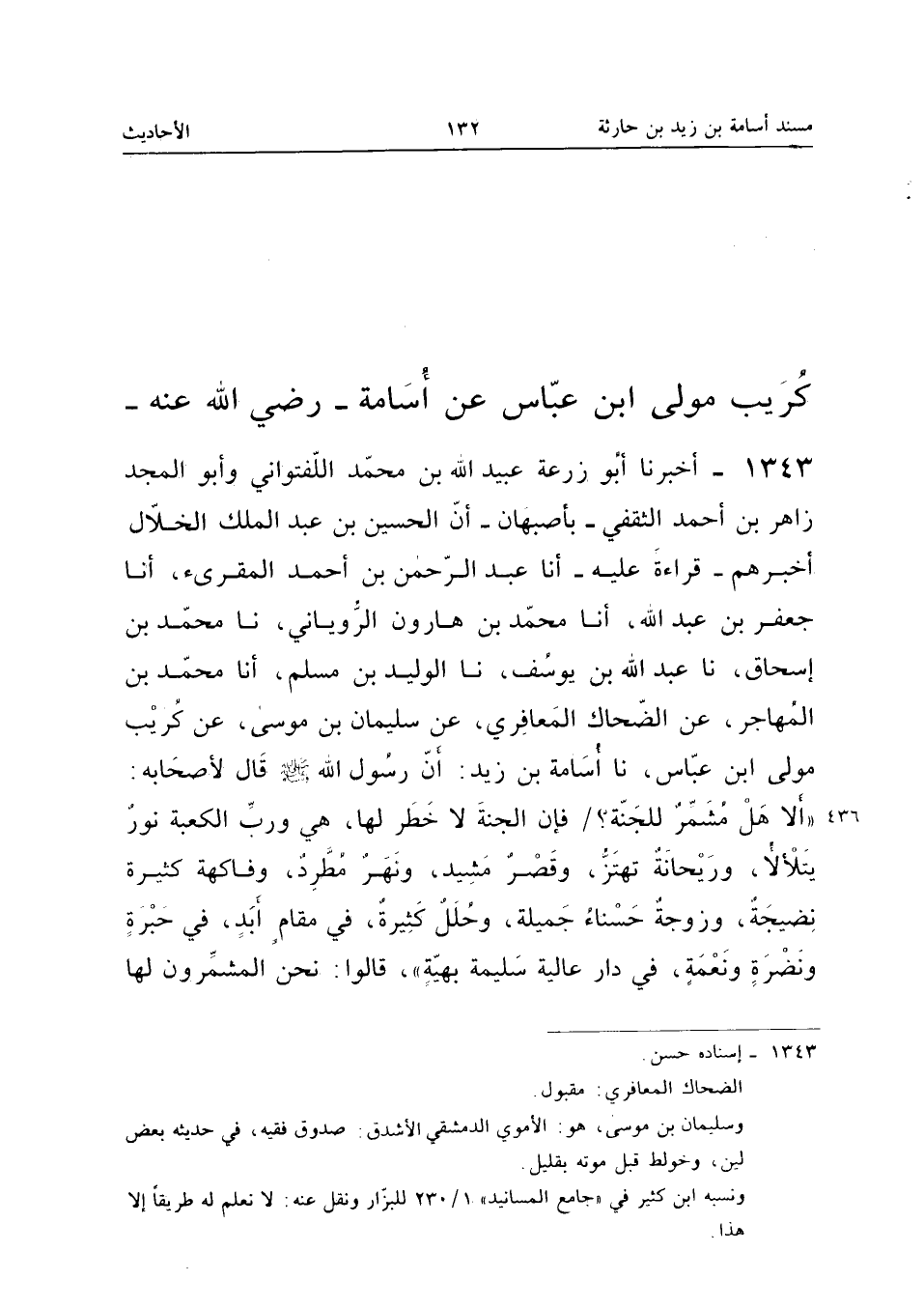 1343 - أَخْبَرَنَا أَبُو زُرْعَةَ عُبَيْدُ اللَّهِ بْنُ مُحَمَّدٍ اللَّفْتُوَانِيُّ وَأَبُو الْمَجْدِ زَاهِرُ بْنُ أَحْمَدَ الثَّقَفِيُّ بِأَصْبَهَانَ أَنَّ الْحُسَيْنَ بْنَ عَبْدِ الْمَلِكِ الْخَلالَ أَخْبَرَهُمْ قِرَاءَةً عَلَيْهِ أَنا عَبْدُ الرَّحْمَنِ بْنُ أَحْمَدَ الْمُقْرِئُ أَنا جَعْفَرُ بْنُ عَبْدِ اللَّهِ أَنا مُحَمَّدُ بْنُ هَارُونَ الرُّويَانِيُّ نَا مُحَمَّدُ بْنُ إِسْحَاقَ نَا عَبْدُ اللَّهِ بْنُ يُوسُفَ نَا الْوَلِيدُ بْنُ مُسْلِمٍ أَنا مُحَمَّدُ بْنُ الْمُهَاجِرِ عَنِ الضَّحَّاكِ الْمُعَافِرِيِّ عَنْ سُلَيْمَانَ بْنِ مُوسَى عَنْ كُرَيْبٍ مَوْلَى ابْنِ عَبَّاسٍ نَا أُسَامَةَ بْنِ زَيْدٍ أَنَّ رَسُولَ اللَّهِ صَلَّى اللَّهُ عَلَيْهِ وَسَلَّمَ قَالَ لأَصْحَابِهِ أَلا هَلْ مشمر للجنة م فَإِنَّ الْجَنَّةَ لَا خَطَرَ لَهَا هِيَ وَرَبِّ الْكَعْبَةِ نُورٌ يَتَلأْلأُ وَرَيْحَانَةٌ تَهْتَزُّ وَقَصْرٌ مَشِيدٌ وَنَهْرٌ مُطَّرِدٌ وَفَاكِهَةٌ كَثِيرَةٌ نَضِيجَةٌ وَزَوْجَةٌ حَسْنَاءُ جميلَة وحلل كَثِيرَة فِي مقَام أَبَد فِي حَبْرَةٍ وَنَضْرَةٍ وَنِعْمَةٍ فِي دَارٍ عَالِيَةٍ سَلِيمَةٍ بَهِيَّةٍ قَالُوا نَحْنُ الْمُشَمِّرُونَ لَهَا