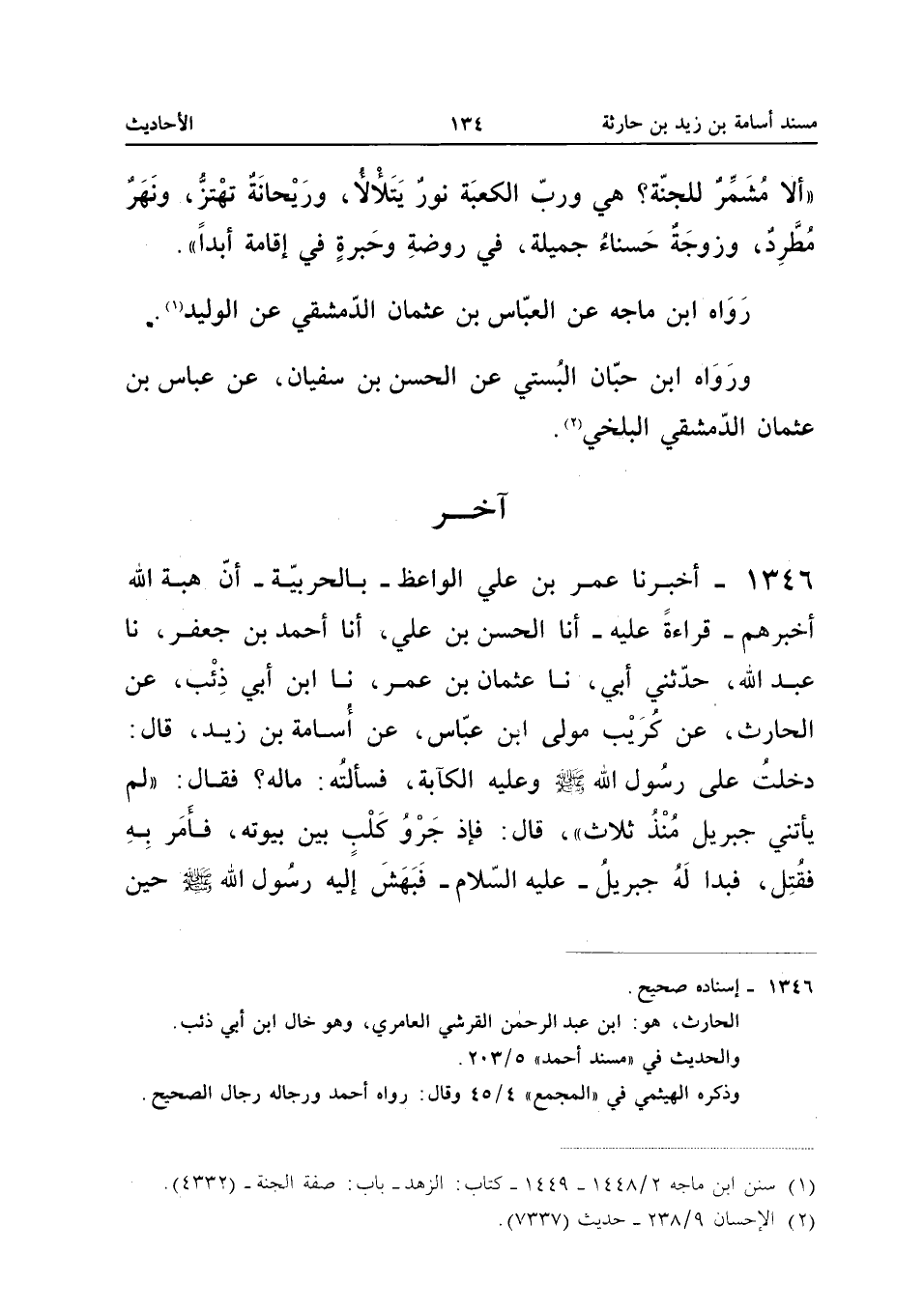 1346 - أَخْبَرَنَا عُمَرُ بْنُ عَلِيٍّ الْوَاعِظُ بِالْحَرْبِيَّةِ أَنَّ هِبَةَ اللَّهِ أَخْبَرَهُمْ قِرَاءَةً عَلَيْهِ أَنا الْحَسَنُ بْنُ عَلِيٍّ أَنا أَحْمَدُ بْنُ جَعْفَرٍ نَا عَبْدُ اللَّهِ حَدَّثَنِي أَبِي نَا عُثْمَانُ بْنُ عُمَرَ نَا ابْنُ أَبِي ذِئْبٍ عَنِ الْحَارِثِ عَنْ كُرَيْبِ مَوْلَى ابْنِ عَبَّاسٍ عَنْ أُسَامَةَ بْنِ زَيْدٍ قَالَ دَخَلْتُ عَلَى رَسُولِ اللَّهِ صَلَّى اللَّهُ عَلَيْهِ وَسَلَّمَ وَعَلَيْهِ الْكَآبَةُ فَسَأَلْتُهُ مَالَهُ فَقَالَ لَمْ يَأْتِنِي جِبْرِيلُ مُنْذُ ثَلاثٍ قَالَ فَإِذَا جَرْوُ كَلْبٍ بَيْنَ بُيُوتِهِ فَأَمَرَ بِهِ فَقُتِلَ فَبَدَا لَهُ جِبْرِيلُ عَلَيْهِ السَّلامُ فَبَهَشَ إِلَيْهِ رَسُولُ اللَّهِ صَلَّى اللَّهُ عَلَيْهِ وَسلم حِين