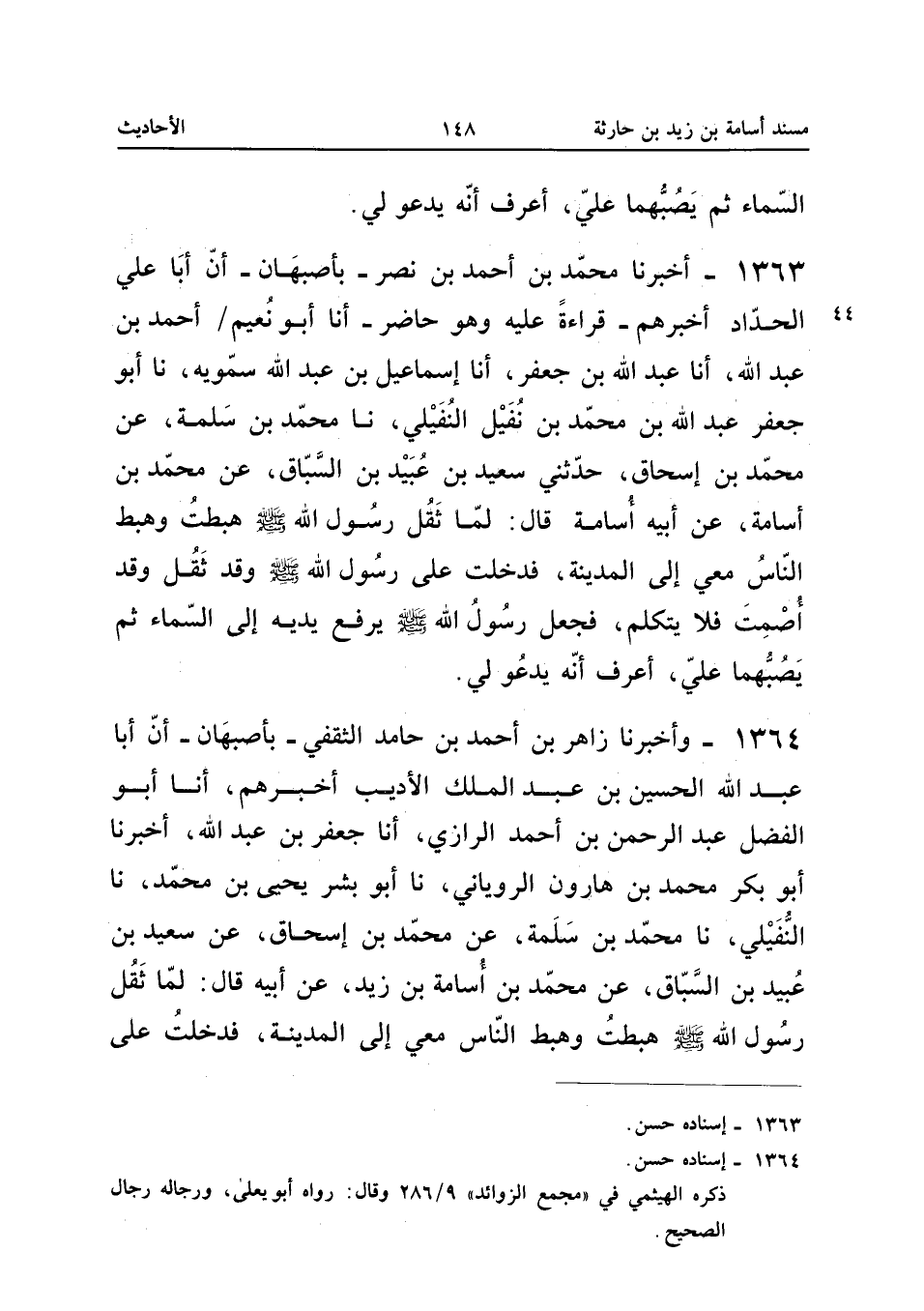 1363 - أَخْبَرَنَا مُحَمَّدُ بْنُ أَحْمَدَ بْنِ نَصْرٍ بِأَصْبَهَانَ أَنَّ أَبَا عَلِيٍّ الْحَدَّادَ أَخْبَرَهُمْ قِرَاءَةً عَلَيْهِ وَهُوَ حَاضِرٌ أَنا أَبُو نُعَيْمٍ أَحْمَدُ بْنُ عَبْدِ اللَّهِ أَنا عَبْدُ اللَّهِ بْنُ جَعْفَرِ أَنا إِسْمَاعِيلُ بْنُ عَبْدِ اللَّهِ سَمُّوَيْهِ نَا أَبُو جَعْفَرٍ عَبْدُ اللَّهِ بْنُ مُحَمَّدِ بْنِ نُفَيْلٍ النُّفَيْلِيُّ نَا مُحَمَّدُ بْنُ سَلَمَةَ عَنْ مُحَمَّدِ بْنِ إِسْحَاقَ حَدَّثَنِي سَعِيدُ بْنُ عُبَيْدِ بْنِ السَّبَّاقِ عَنْ مُحَمَّدِ بْنِ أُسَامَةَ عَنْ أَبِيهِ أُسَامَةَ قَالَ لَمَّا ثَقُلَ رَسُولُ اللَّهِ صَلَّى اللَّهُ عَلَيْهِ وَسَلَّمَ هَبَطْتُ وَهَبَطَ النَّاسُ مَعِي إِلَى الْمَدِينَةِ فَدَخَلْتُ عَلَى رَسُولِ اللَّهِ صَلَّى اللَّهُ عَلَيْهِ وَسَلَّمَ وَقَدْ ثَقُلَ وَقَدْ أُصْمِتَ فَلا يَتَكَلَّمُ فَجَعَلَ رَسُولُ اللَّهِ صَلَّى اللَّهُ عَلَيْهِ وَسَلَّمَ يَرْفَعُ يَدَيْهِ إِلَى السَّمَاءِ ثُمَّ يَصُبُّهُمَا عَلَيَّ أَعْرِفُ أَنَّهُ يَدْعُو لِي إِسْنَاده حسن
