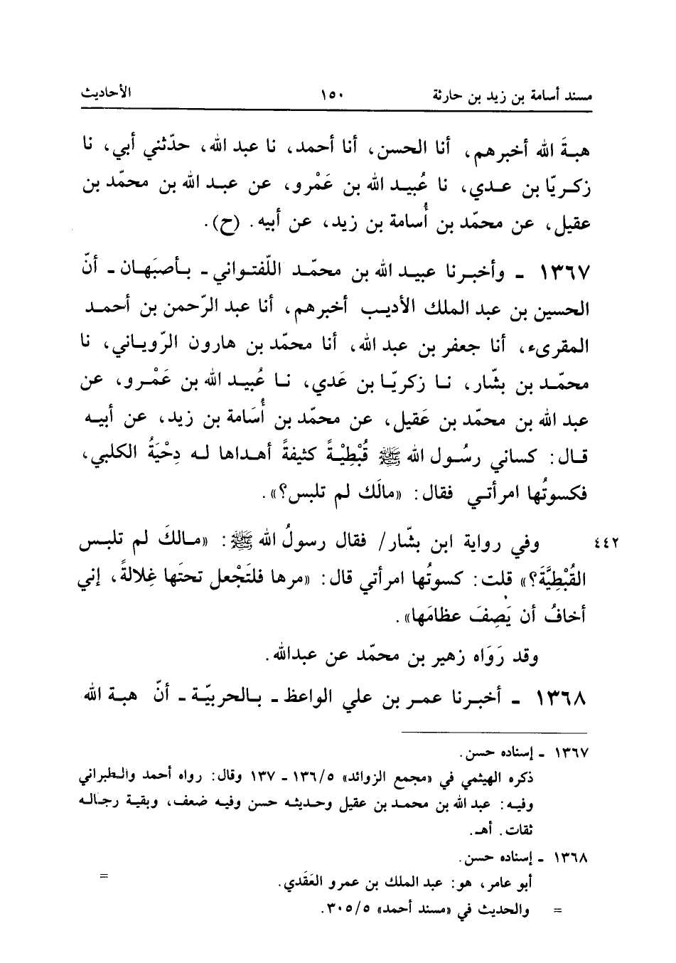 1369 - أَخْبَرَنَا عَبْدُ اللَّهِ بْنُ أَحْمَدَ بْنِ أَبِي الْمَجْدِ الْحَرْبِيُّ بِالْحَرْبِيَّةِ أَنَّ هِبَةَ اللَّهِ أخبرهُمْ أَنا الْحَسَنُ أَنا أَحْمَدُ نَا عَبْدُ اللَّهِ حَدَّثَنِي أَبِي نَا أَحْمَدُ بْنُ عَبْدِ الْمَلِكِ نَا مُحَمَّدُ بْنُ سَلَمَةَ عَنْ مُحَمَّدِ بْنِ إِسْحَاقَ عَنْ يَزِيدَ بْنِ عَبْدِ اللَّهِ بْنِ قُسَيْطٍ عَنْ مُحَمَّدِ بْنِ أُسَامَةَ عَنْ أَبِيهِ قَالَ اجْتَمَعَ جَعْفَرٌ وَعَلِيٌّ وَزَيْدُ بْنُ حَارِثَةَ فَقَالَ جَعْفَرٌ أَنَا أَحَبُّكُمْ إِلَى رَسُولِ اللَّهِ صَلَّى اللَّهُ عَلَيْهِ وَسَلَّمَ وَقَالَ عَلِيٌّ أَنَا أَحَبُّكُمْ إِلَى رَسُولِ اللَّهِ صَلَّى اللَّهُ عَلَيْهِ وَسَلَّمَ وَقَالَ زَيْدٌ أَنَا أَحَبُّكُمْ إِلَى رَسُولِ اللَّهِ صَلَّى اللَّهُ عَلَيْهِ وَسَلَّمَ فَقَالُوا انْطَلِقُوا بِنَا إِلَى رَسُولِ اللَّهِ صَلَّى اللَّهُ عَلَيْهِ وَسَلَّمَ حَتَّى نَسْأَلَهُ قَالَ أُسَامَةُ فَجَاءُوا يَسْتَأْذِنُونَهُ فَقَالَ اخْرُجْ فَانْظُرْ مَنْ