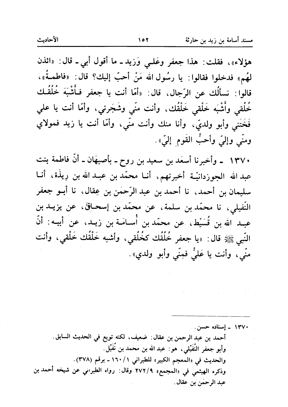 1370 - وَأَخْبَرَنَا أَسْعَدُ بْنُ سَعِيدِ بْنِ رَوْحٍ بِأَصْبَهَانَ أَنَّ فَاطِمَةَ بِنْتَ عَبْدِ اللَّهِ الْجَوْزِدَانِيَّةَ أَخْبَرَتْهُمْ أَنَا مُحَمَّدُ بْنُ عَبْدِ اللَّهِ بْنِ رِيذَةَ أَنا سُلَيْمَانُ بْنُ أَحْمَدَ نَا أَحْمَدُ بْنُ عَبْدِ الرَّحْمَنِ بْنِ عِقَالٍ نَا أَبُو جَعْفَرٍ النُّفَيْلِيُّ نَا مُحَمَّدُ بْنُ سَلَمَةَ عَنْ مُحَمَّدِ بْنِ إِسْحَاقَ عَنْ يَزِيدَ بْنِ عَبْدِ اللَّهِ بن قسيط عَن مُحَمَّد بن سامة بْنِ زَيْدٍ عَنْ أَبِيهِ أَنَّ النَّبِيَّ صَلَّى اللَّهُ عَلَيْهِ وَسَلَّمَ قَالَ يَا جَعْفَرُ خَلْقُكَ كَخَلْقِي وَأَشْبَهَ خُلُقُكَ خُلُقِي وَأَنْتَ مِنِّي وَأَنْتَ يَا عَلِيُّ فَمِنِّي وَأَبُو وَلَدِي