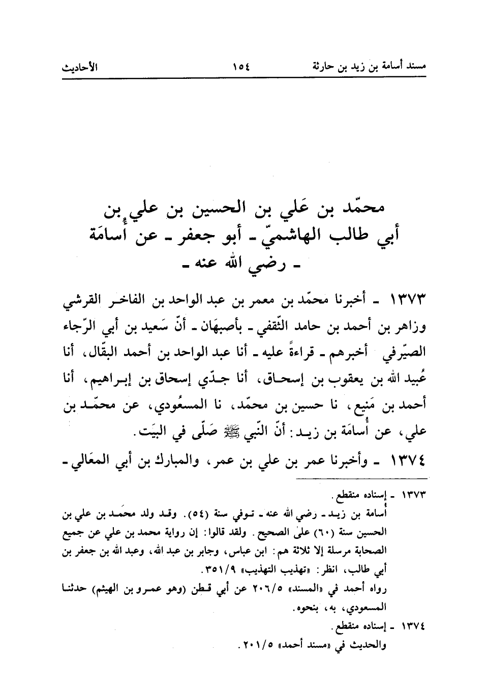 1374 - وَأَخْبَرَنَا عُمَرُ بْنُ عَلِيِّ بْنِ عُمَرَ وَالْمُبَارَكُ بْنُ أَبِي الْمَعَالِي بِبَغْدَادَ أَنَّ هِبَةَ اللَّهِ بْنَ مُحَمَّدٍ أَخْبَرَهُمْ أَنَا الْحَسَنُ بْنُ عَلِيٍّ أَنا أَحْمَدُ بْنُ جَعْفَرٍ نَا عَبْدُ اللَّهِ بْنُ أَحْمَدَ حَدَّثَنِي أَبِي نَا هَاشِمُ بْنُ الْقَاسِمِ نَا الْمَسْعُودِيُّ نَا مُحَمَّدُ بْنُ عَلِيٍّ أَبُو جَعْفَرٍ عَنْ أُسَامَةَ بْنِ زَيْدٍ قَالَ صَلَّى رَسُولُ اللَّهِ