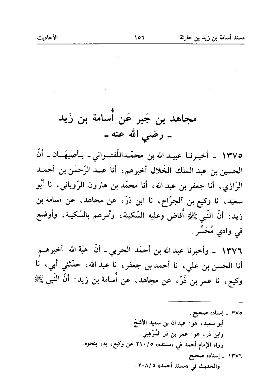 1375 - أَخْبَرَنَا عُبَيْدُ اللَّهِ بْنُ مُحَمَّدٍ اللَّفْتُوَانِيُّ بِأَصْبَهَانَ أَنَّ الْحُسَيْنَ بْنَ عَبْدِ الْمَلِكِ الْخَلالَ أَخْبَرَهُمْ أَنا عَبْدُ الرَّحْمَنِ بْنُ أَحْمَدَ الرَّازِيُّ أَنا جَعْفَرُ بْنُ عَبْدِ اللَّهِ أَنا مُحَمَّدُ بْنُ هَارُونَ الرُّويَانِيُّ نَا أَبُو سَعِيدٍ نَا وَكِيعُ بْنُ الْجَرَّاحِ نَا ابْنُ ذَرٍّ عَنْ مُجَاهِدٍ عَنْ أُسَامَةَ بْنِ زَيْدٍ أَنَّ النَّبِيَّ صَلَّى اللَّهُ عَلَيْهِ وَسَلَّمَ أَفَاضَ وَعَلَيْهِ السَّكِينَةُ وَأَمَرَهُمْ بِالسَّكِينَةِ وأوضع فِي وَادي محسر إِسْنَاده صَحِيح