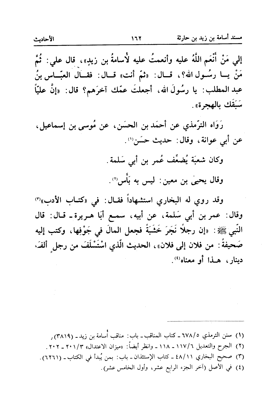 إِلَيَّ مَنْ أَنْعَمَ اللَّهُ عَلَيْهِ وَأَنْعَمْتُ عَلَيْهِ لأُسَامَةُ بْنُ زَيْدٍ قَالَ عَلِيٌّ ثُمَّ مَنْ يَا رَسُولَ اللَّهِ قَالَ ثُمَّ أَنْتَ قَالَ فَقَالَ الْعَبَّاسُ بْنُ عَبْدِ الْمُطَّلِبِ يَا رَسُولَ اللَّهِ أَجَعَلْتَ عَمَّكَ آخِرَهُمْ قَالَ إِنَّ عَلِيًّا سَبَقَكَ بِالْهِجْرَةِ رَوَاهُ التِّرْمِذِيُّ عَنْ أَحْمَدَ بْنِ الْحَسَنِ عَنْ مُوسَى بْنِ إِسْمَاعِيلَ عَنْ أَبِي عَوَانَةَ وَقَالَ حَدِيثٌ حَسَنٌ وَكَانَ شُعْبَةُ يُضَعِّفُ عُمَرَ بْنِ أَبِي سَلَمَةَ وَقَالَ يَحْيَى بْنُ مَعِينٍ لَيْسَ بِهِ بَأْسٌ وَقَدْ رَوَى لَهُ الْبُخَارِيُّ اسْتِشْهَادًا فَقَالَ فِي كِتَابِ الأَدَبِ وَقَالَ عُمَرُ بْنُ أَبِي سَلَمَةَ عَنْ أَبِيهِ سَمِعَ أَبَا هُرَيْرَةَ قَالَ قَالَ النَّبِيُّ صَلَّى اللَّهُ عَلَيْهِ وَسَلَّمَ إِنَّ رَجُلا نَجَرَ خَشَبَةً فَجَعَلَ الْمَالَ فِي جَوْفِهَا وَكَتَبَ إِلَيْهِ صَحِيفَةً مِنْ فُلانٍ إِلَى فُلانٍ الْحَدِيثَ الَّذِي اسْتَسْلَفَ مِنْ رجل ألف دِينَار هَذَا أَو مَعْنَاهُ