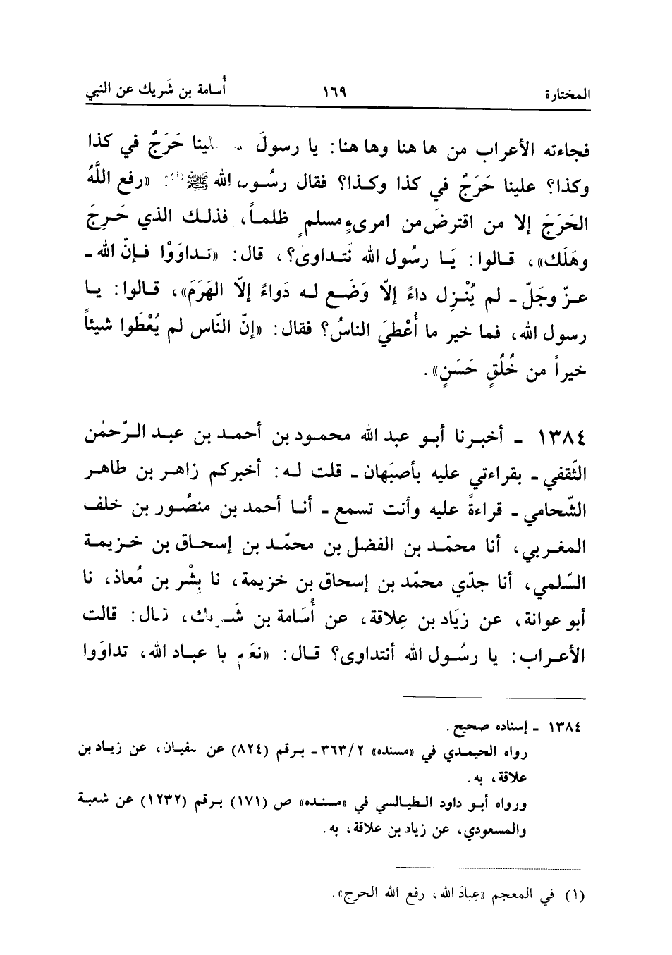 1384 - أَخْبَرَنَا أَبُو عَبْدِ اللَّهِ مَحْمُودُ بْنُ أَحْمَدَ بْنِ عَبْدِ الرَّحْمَنِ الثَّقَفِيُّ بِقِرَاءَتِي عَلَيْهِ بِأَصْبَهَانَ قُلْتُ لَهُ أخبركُمْ زَاهِرُ بْنُ طَاهِرٍ الشَّحَّامِيُّ قِرَاءَةً عَلَيْهِ وَأَنْتَ تَسْمَعُ أَنا أَحْمَدُ بْنُ مَنْصُورِ بْنِ خَلَفٍ الْمَغْرِبِيُّ أَنا مُحَمَّدُ بْنُ الْفَضْلِ بْنِ مُحَمَّدِ بْنِ إِسْحَاقَ بْنِ خُزَيْمَةَ السُّلَمِيُّ أَنا جَدِّي مُحَمَّدُ بْنُ إِسْحَاقَ بْنِ خُزَيْمَةَ نَا بِشْرُ بْنُ مُعَاذٍ نَا أَبُو عَوَانَةَ عَنْ زِيَادِ بْنِ عَلاقَةَ عَنْ أُسَامَةَ بْنِ شَرِيكٍ قَالَ قَالَتِ الأَعْرَابُ يَا رَسُولَ اللَّهِ أَنَتَدَاوَى قَالَ نَعَمْ يَا عِبَادَ اللَّهِ تَدَاوَوْا فَإِنَّ اللَّهَ لَمْ يَضَعْ دَاءً إِلا وَضَعَ لَهُ شِفَاءً إِلا دَاءً وَاحِدًا قَالُوا وَمَا هُوَ قَالَ الْهَرم إِسْنَاده صَحِيح